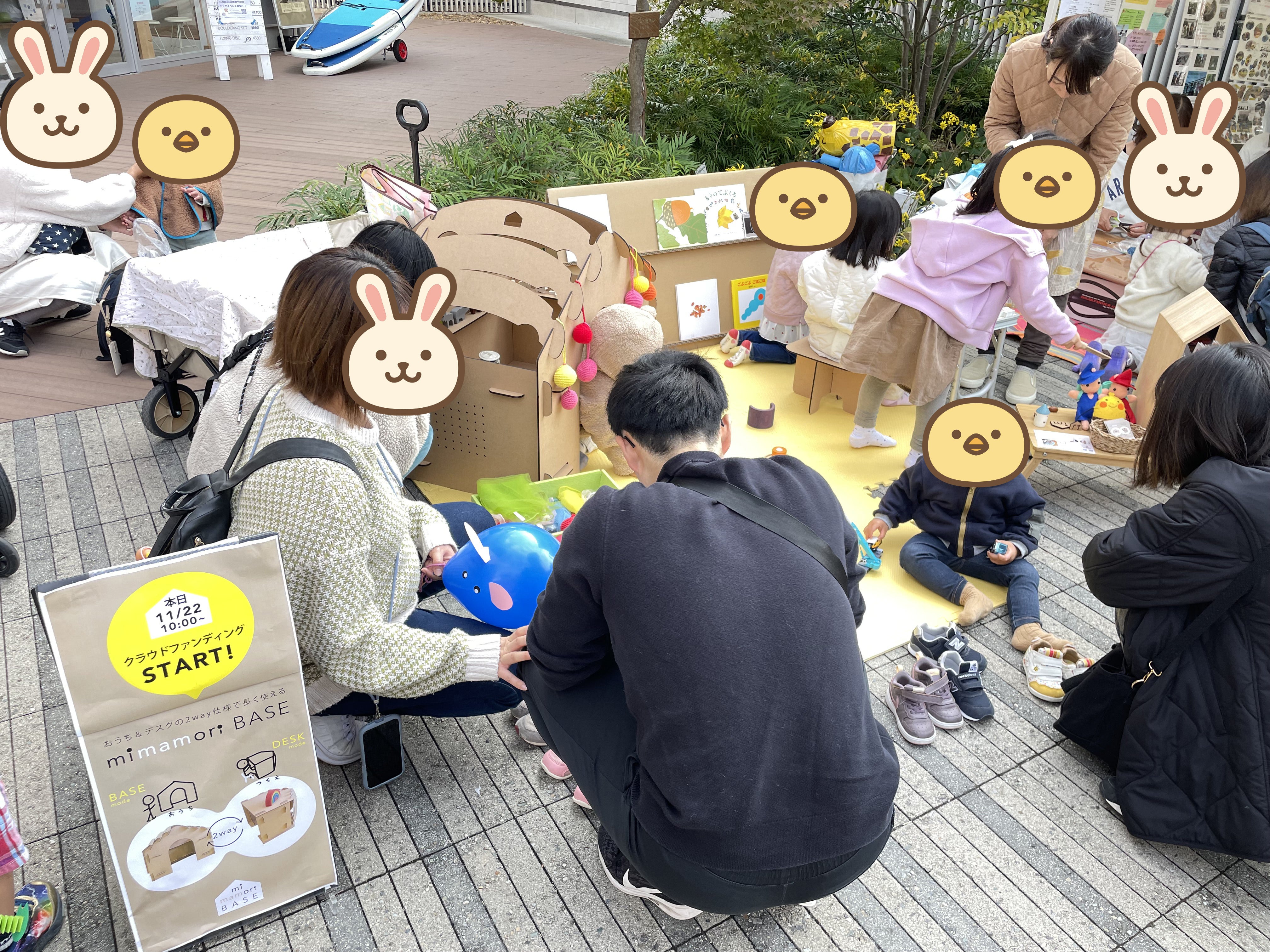 ひっきりなしに、たくさんの親子が遊びに来てくださり、mimamori BASEの中に入ったり、補強棚におもちゃを並べたり、屋根に飾り付けてくれださったそうです。