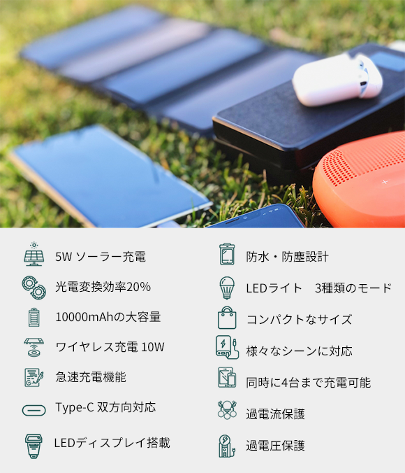 さらに、3つの出力(USB-A×2、USB-C)とワイヤレス充電パネルが付属しているため、複数のデバイスをすばやく充電できます。実用的なLEDライトも内蔵されており、災害時やアウトドアでも大活躍です!