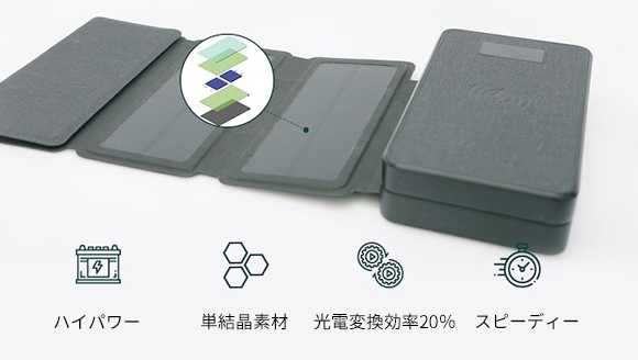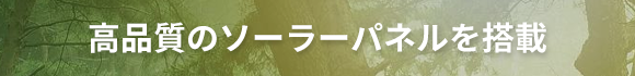 ② 折り畳み式ソーラーパネル4枚付き。単結晶シリコン製で変換効率が高い。
