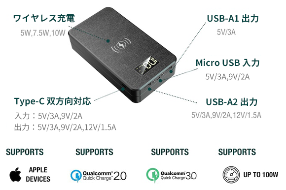 A:本製品はQi規格ワイヤレス充電機能を搭載しているので、Qi規格に対応したデバイスであれば充電が可能です。