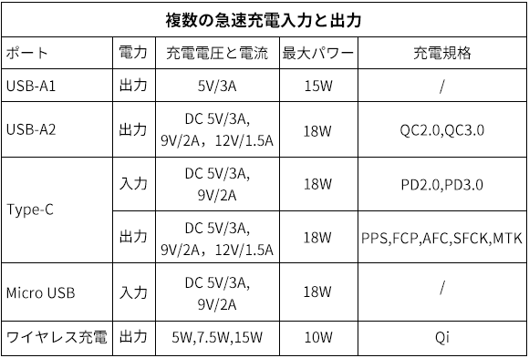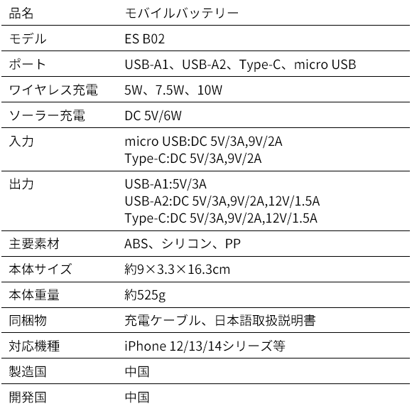 ES B02はUSB-Aポート(×2)とType-Cポート(×1)を装備しています。QC / PD / ワイヤレスQiおよびその他の高速充電規格をサポートし、最大18Wの出力に達します。また、入力に関してはソーラー充電だけではなく、Micro USBとType-Cにも対応しています。