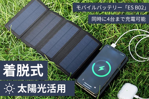 「ES B02」とは、持ち運びに便利な着脱式ソーラーモバイルバッテリーです。ソーラーパネルはマグネットコネクタで主電源に接続され、簡単に取り外せるので、日常生活でも使用できます。