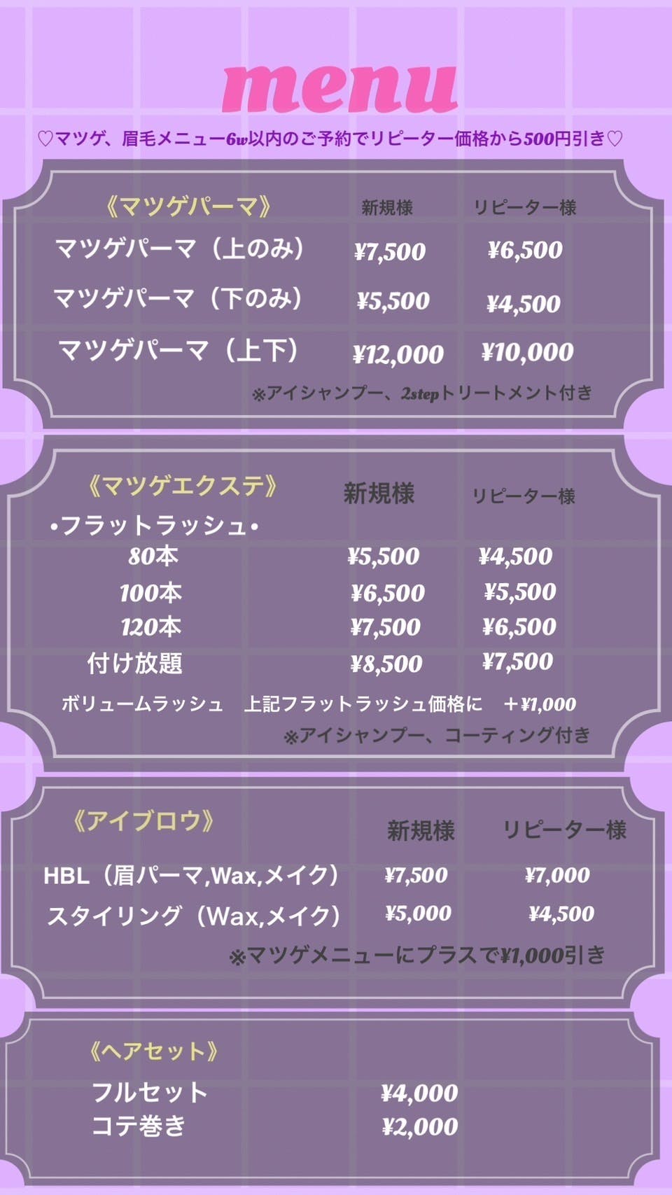 ・まつ毛お得チケット :¥13,000分の技術料⇒¥10,000/¥27,000分の技術料⇒¥20,000