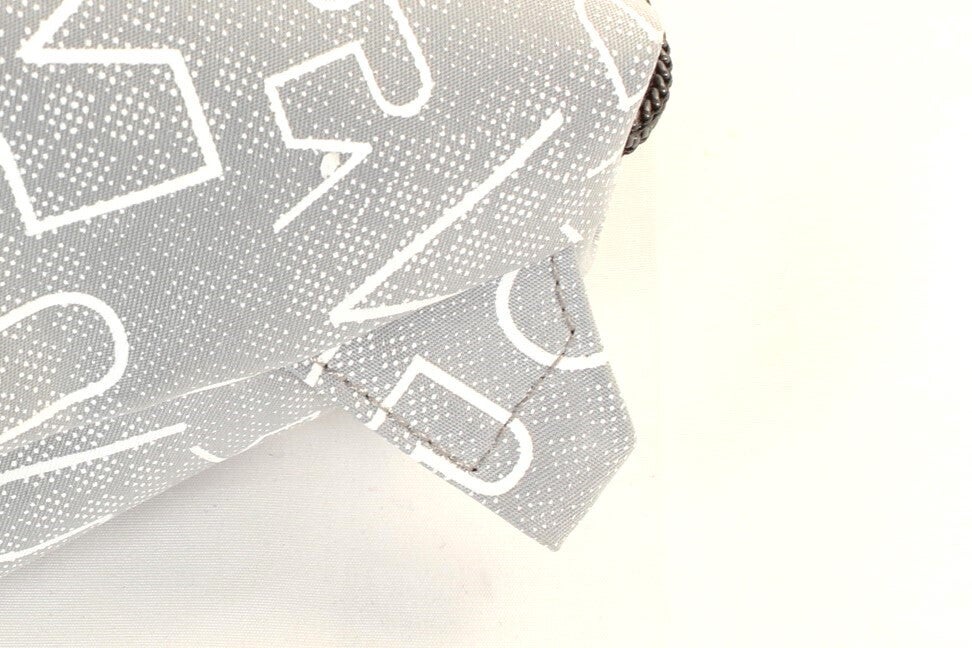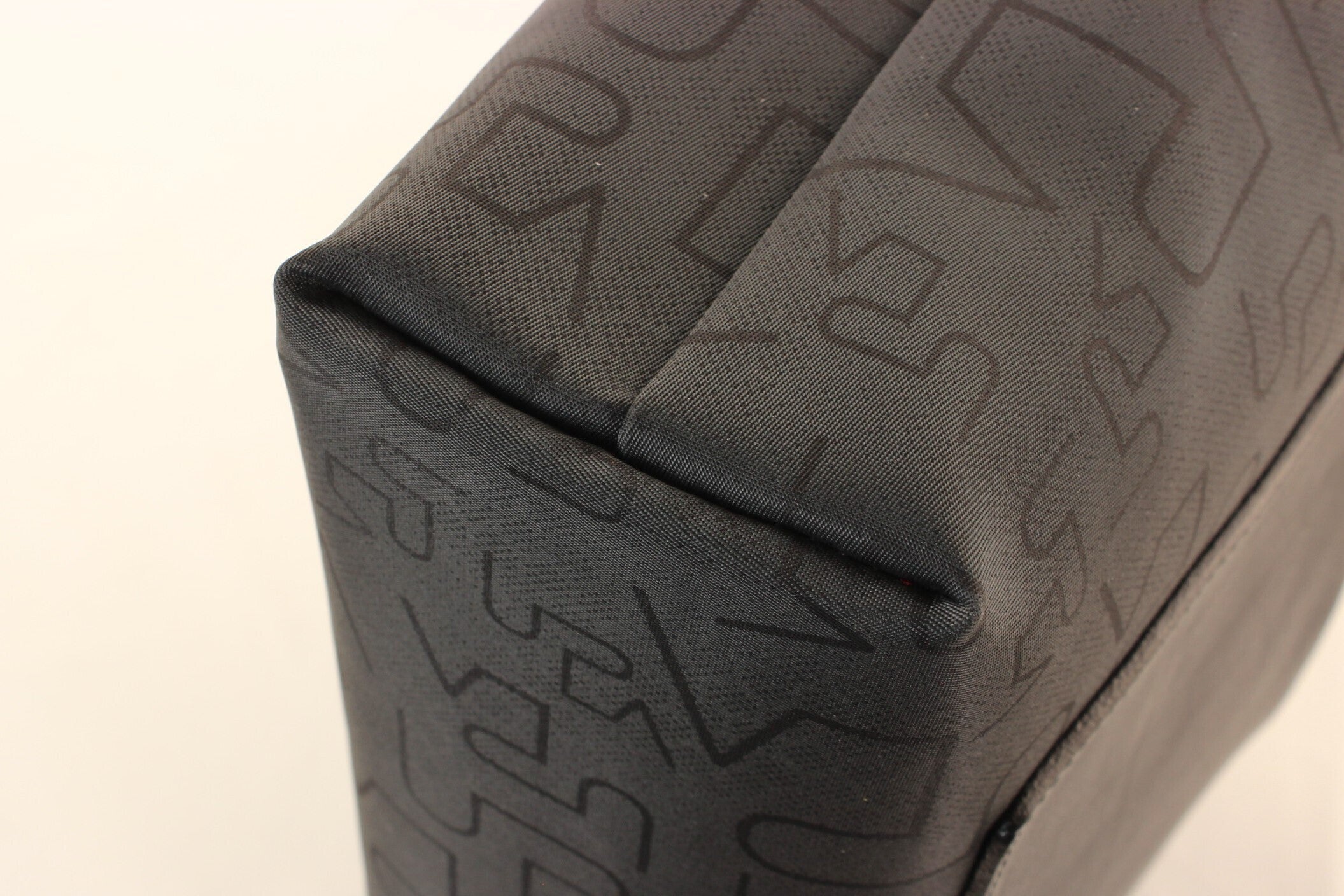 一般的なバッグは、こういった素材にPVC等で裏打ちして強化した生地をバッグの主素材として用います。この方式だとローコストでできますが、重いわりに生地がクタッとしてしまいます。UPLA独自のWTWPナイロン素材は、高密度ナイロン生地を2枚用いてこれらを全面的にべったりと貼り合わせています。その上に全面プリントを施し、さらにもう一度限界までの細かさで地模様をプリントしています。