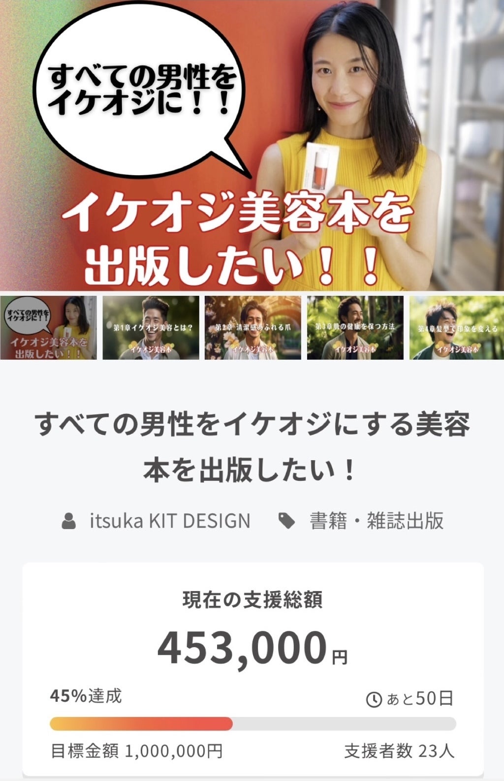 「イケオジ」への変身をサポートする美容本を出版します。男性自身の美容への関心と理解を深め、人生を豊かにするための新たな一歩を応援します。皆様のご協力をお願いします!