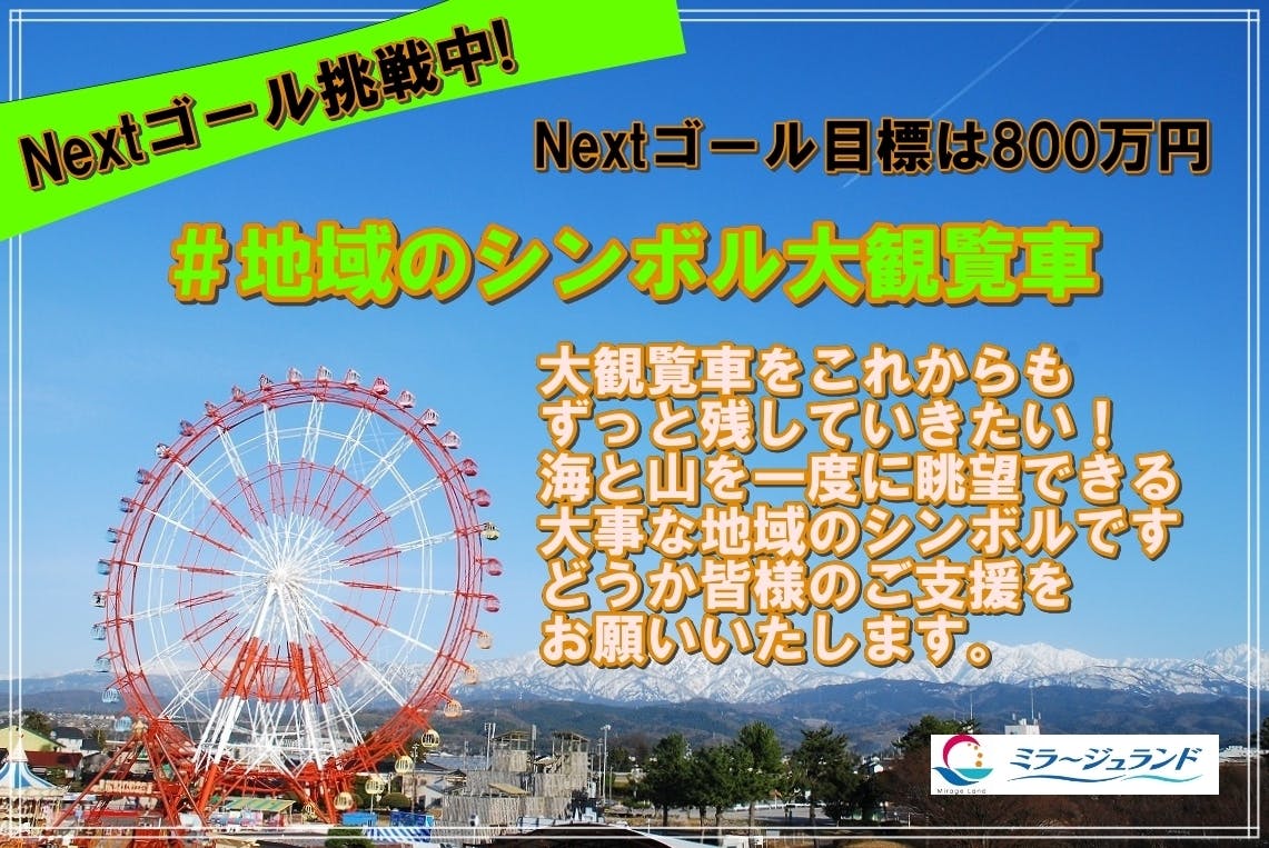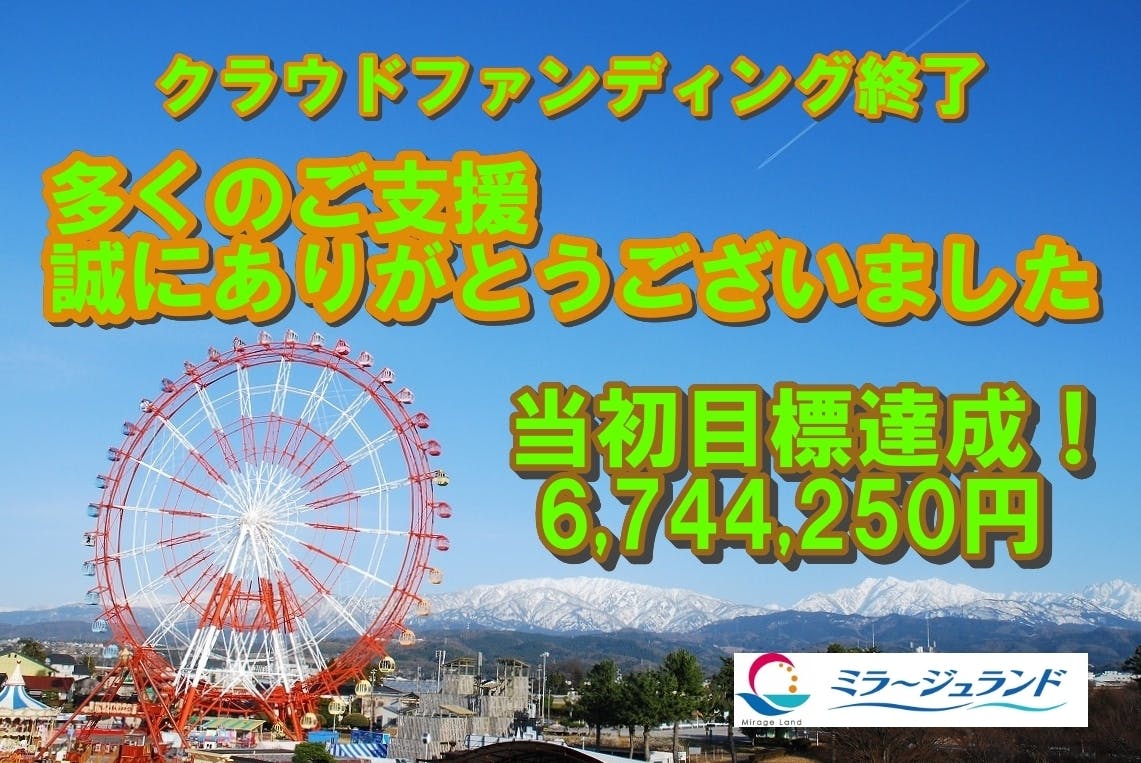 2023/09/03 21:48「地域のシンボル大観覧車存続を!」プロジェクトにご支援いただきました皆様へ「富山県魚津市ミラージュランド「地域のシンボル大観覧車存続を!」プロジェクト」オーナーのミラージュランドです。 この度はミラージュランド「地域のシンボル大観覧車存続を!」プロジェクトのクラウドファインディングにご支援を賜り誠にありがとうございました。 7月1日から2か月の期間におきましてクラウドファンディング上では408人の方々から、6,744,250円ものご支援いただきました。当初目標でありました500万円は開始から約1か月にて達成し、Nextゴールにて800万円を第2目標として行ってまいりました。惜しくもNextゴールの目標には達成しませんでしたが、今後多くの皆様より頂きましたご支援金は大観覧車の存続に向けての塗装工事にて確実にそして大切に活用させていただきます。また現段階におきましてクラウドファンディング以外にも直接お持ち頂いた皆様や地域の企業様等からのご支援も含めまして総額が8月31日にて13,015,785円(CF・手数料等差引含む)となりましたことも併せてご報告させていただきます。 これからもミラージュランドは地域の皆様に愛され、親しんでいただき笑顔や歓声が絶えない遊園地として運営を続けてまいります。 なお、リターン(返礼のりもの券)におきましてはお時間をいただくこととなりますが翌年2024年3月から順次発送をさせていただきますのでお待ちくださいますようお願い申し上げます。(のりもの券有効期限:2024年3月16日~2024年9月15日) まずは書中をもってお礼と結果のご報告とさせていただきます。今後ともミラージュランドをどうぞよろしくお願い致します。2023年9月1日一般財団法人魚津市施設管理公社ミラージュランド理事長 堀 昭禎 もっと見る