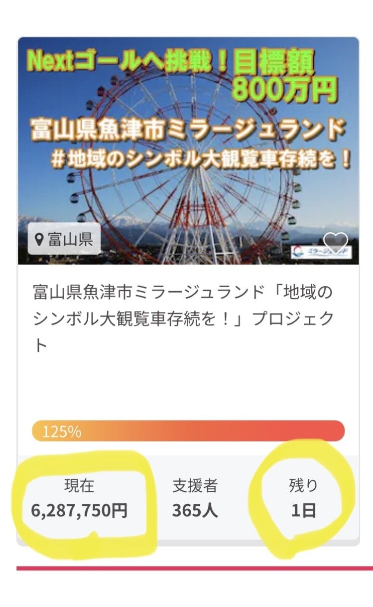 2023/08/30 09:52【あと1日! 8/31が最終日】おはようございます。ミラージュランドでクラウドファンディングを担当しております、森です。このクラウドファンディングの挑戦も、8/31の23:59までとなりました。ここまでご支援してくださった皆様、本当にありがとうございます。おかげさまで第一目標は達成できたものの、本来の工事費用に対して少しでもご協力いただきたく、800万円のネクストゴールを目指しています。そのネクストゴール達成まであと1,712,250円です!支援者の皆様からの応援メッセージを、日々拝見しています。「ミラージュランドが好き」「思い出がある」「頑張れ!」とお気持ちの溢れることばに勇気が湧いてきます。当園や大観覧車が多くの方に愛されていることも、改めて感じることができました。安全安心に利用いただけるように観覧車存続工事を成功させなければならないと感じました。同時に、この存続を一人でも多くの方にご協力いただきながら、多くのひとの手によって達成することの意味を深く考えるようになりました。クラウドファンディングでご支援を募ることは、私たちにとって初めての挑戦でした。不安もありましたし、今もネクストゴールを達成できるだろうかとドキドキしています。それでも、達成した暁には、皆さんがもっともっとミラージュランドに夢中になって、もっともっと感動を届けられると信じています。<最後のお願いです!>■追加支援、大歓迎ですリターン(のりもの券)は全て100%以上の内容となっております。是非ご支援をいただき、来シーズンにご来園の際にのりもの券をご活用いただきたいです。※リターン品のりもの券有効期限 2024年3月16日~9月15日■FacebookやTwitterでこのプロジェクトをご紹介くださいこのクラウドファンディングのページのトップにFacebook、Twitter、LINEへシェアできるボタンがあります。ぜひシェアをしていただき、情報拡散にご協力ください。https://camp-fire.jp/projects/view/675500お願いばかりで恐縮ですが、一人でも多くの方にプロジェクトに参画いただき、魚津とミラージュランドを盛り上げていけることを願って。どうぞよろしくお願い申し上げます。富山県魚津市ミラージュランド「地域のシンボル大観覧車存続を!」プロジェクトクラウドファンディング担当森 もっと見る