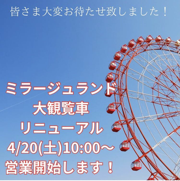 2024/04/19 10:51この度の大観覧車メンテナンス工事でクラウドファンディングによるご支援をしていだいた方々に厚く御礼申し上げます本当にありがとうございました。ミラージュランド大観覧車リニューアル2024年4月20日(土)10:00より営業開始します昨年よりメンテナンス工事により営業を休止していた大観覧車の工事が完了し、いよいよリニューアル営業を開始いたします。全40台のうち39台が青空に映える「イタリアンレッド」に生まれ変わりました!また、お天気が良い日は眼前に広がる富山湾と立山連峰を一望できる15分間の空中散歩をお楽しみいただけます!なお、以前から人気のあった金色のゴンドラは継続しております。大観覧車と共に休止していた「ミラージュトレイン」もご利用いただけます皆様のご来園を心よりお待ちしております。・ミラージュランド公式ホームページ毎週水曜日休園 もっと見る