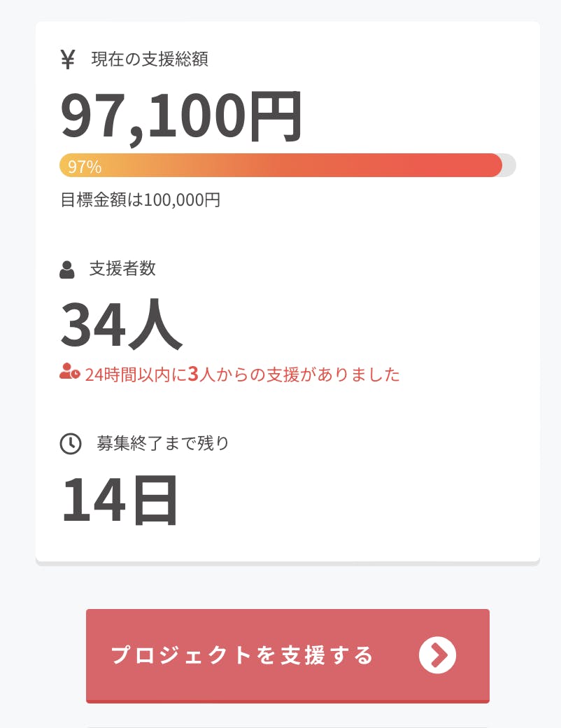6月6日午前9時現在、クラウドファンディングの支援総額が目標金額の97%に到達しました!こえまで支援いただいた34名のみなさんに心から感謝申し上げます。ありがとうございます。
