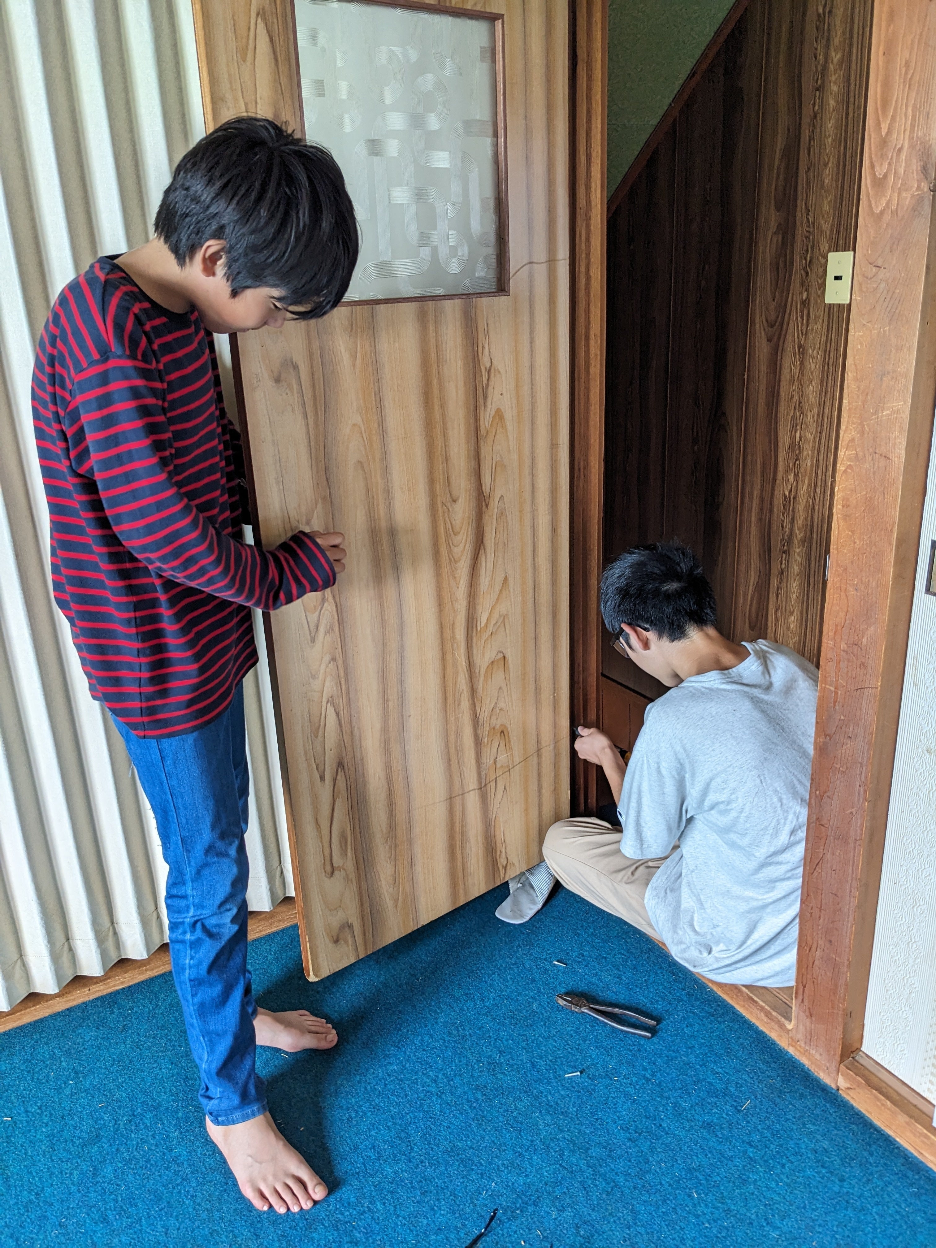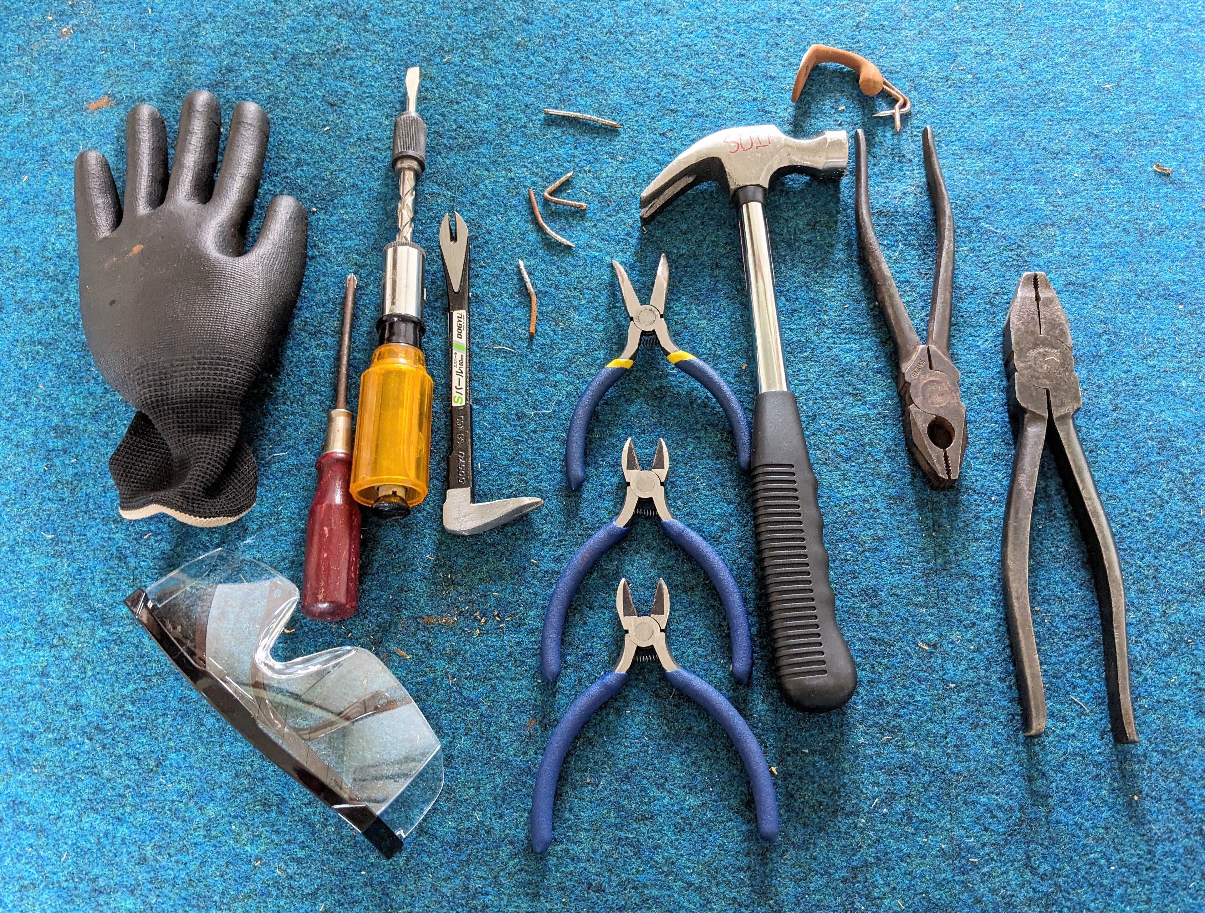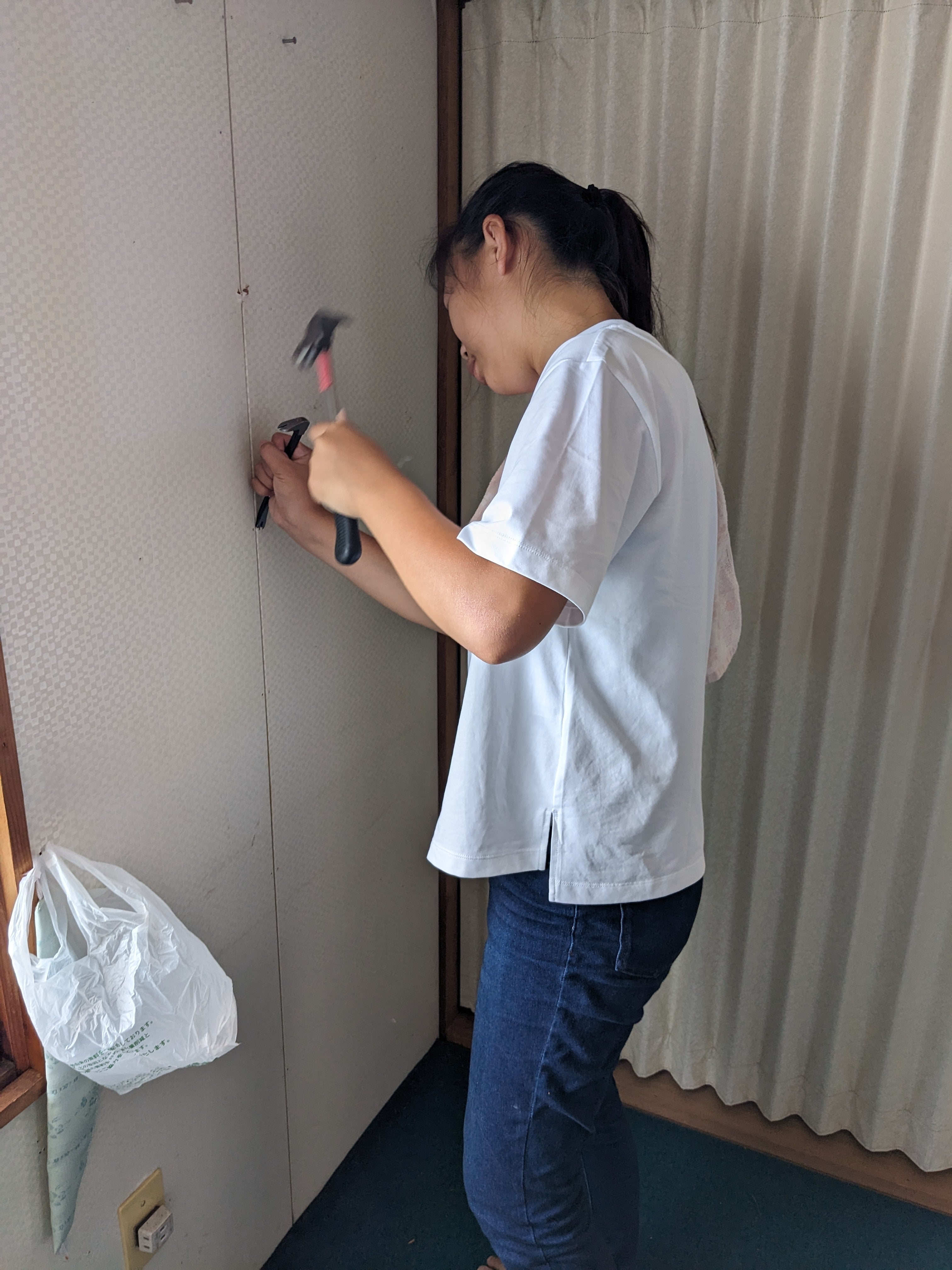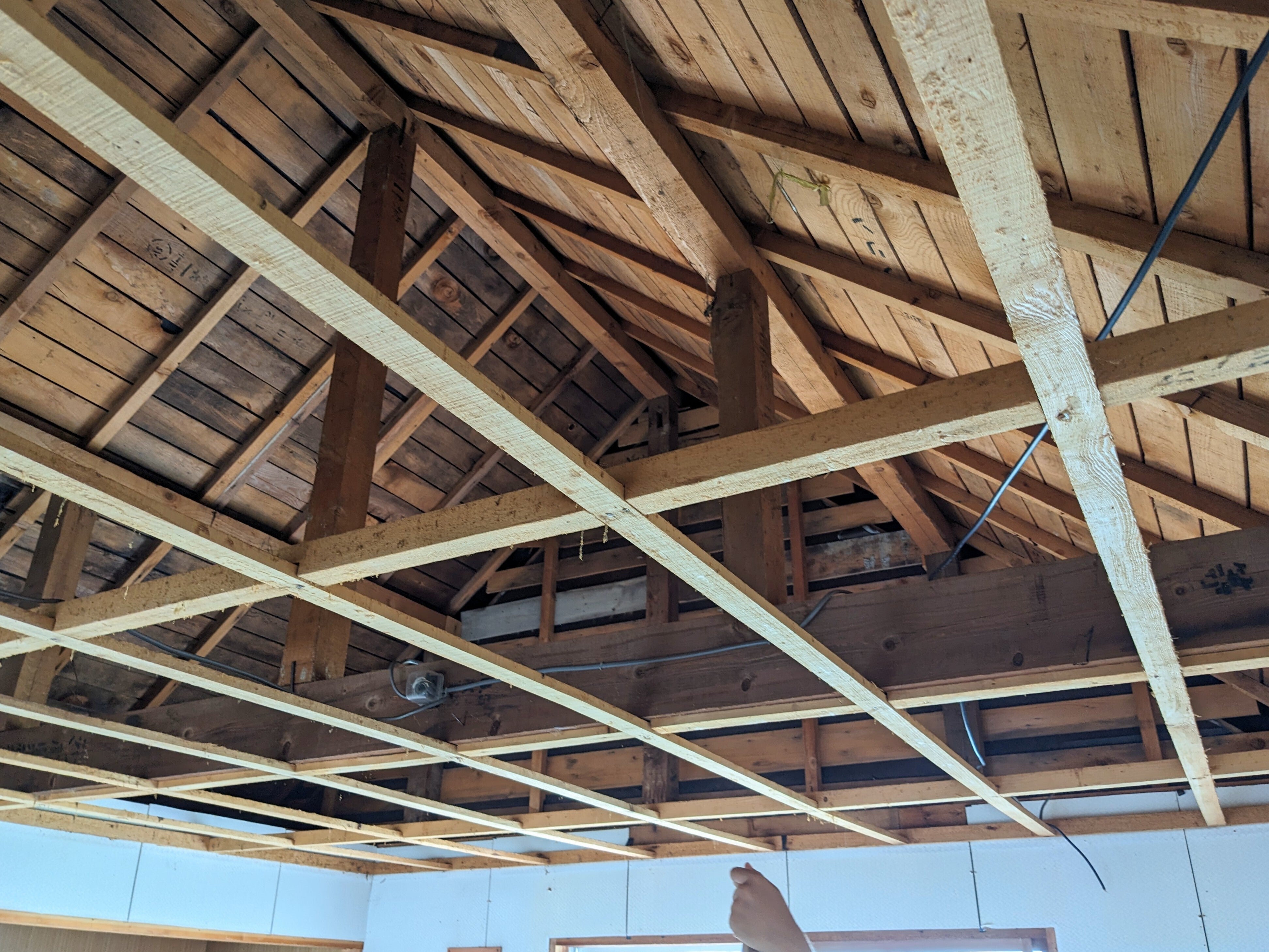ドライバー、ペンチ、バール、ネイルハンマーなどの大工道具を駆使して天井を剥がし終えると、