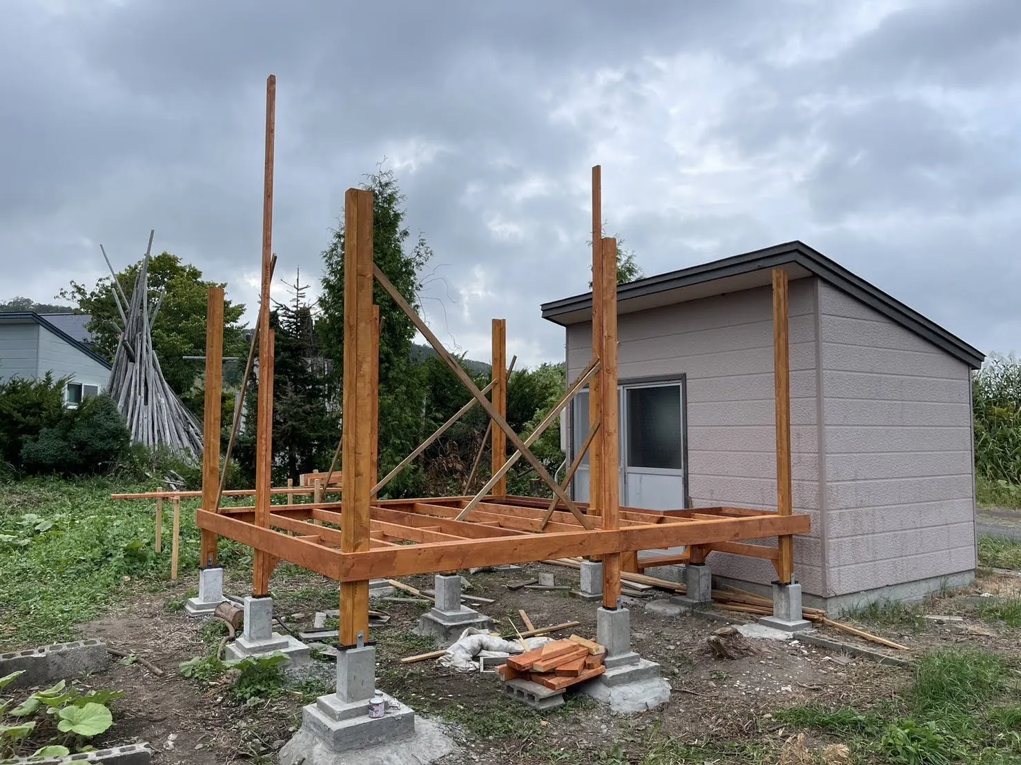 床の骨組みが進み、支柱が立ちました