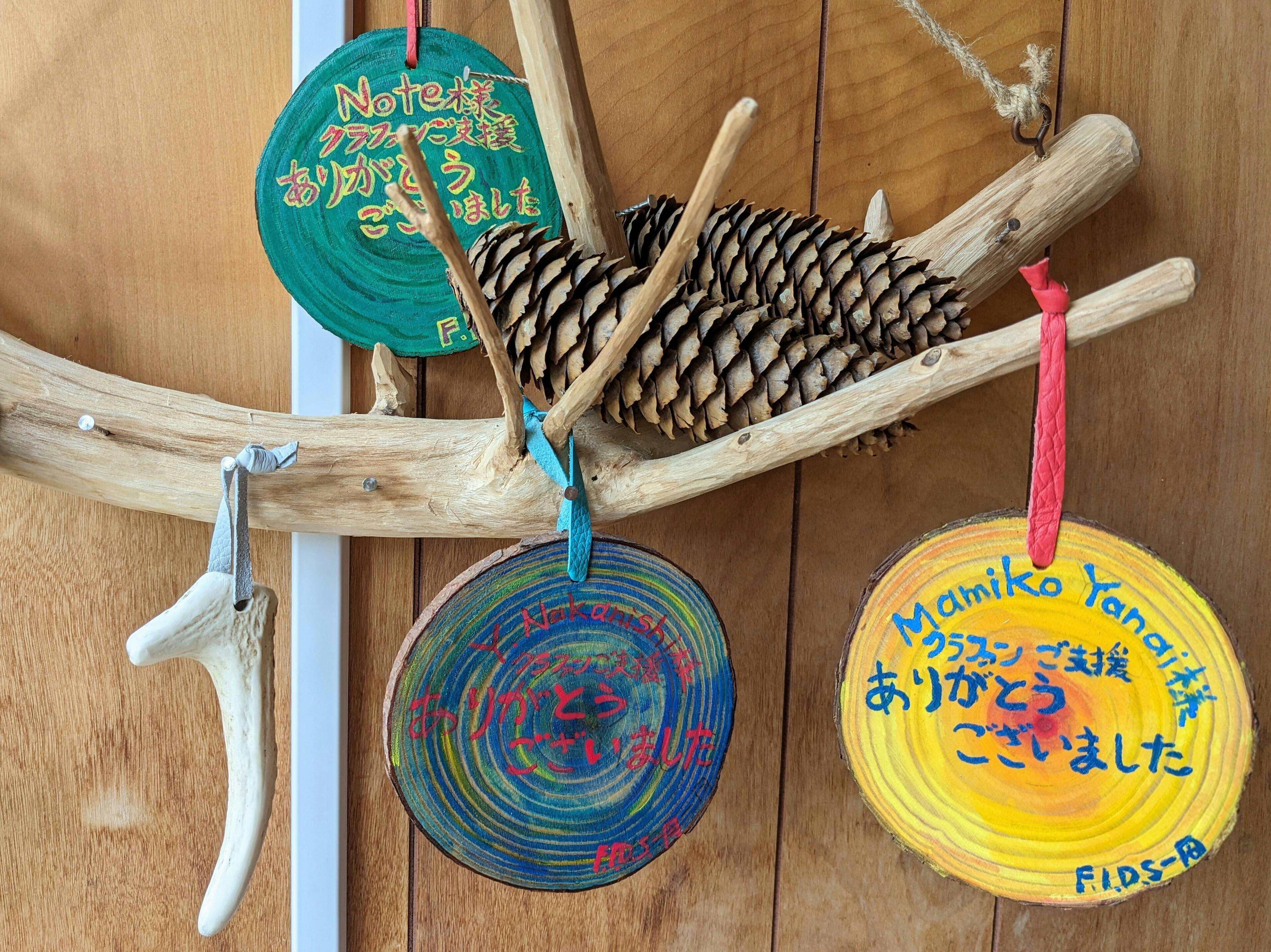 雪が解け、春らしくなった岩見沢。8ヶ月ぶりに古家を訪れました。今回の訪問目的のひとつ、クラファン返礼品のお礼メッセージ入り木製スライスを玄関先のスペースに飾りました。昨夏に生徒のご親戚からいただいた鹿の角と美流渡で拾った松ぼっくりを添えてみました。