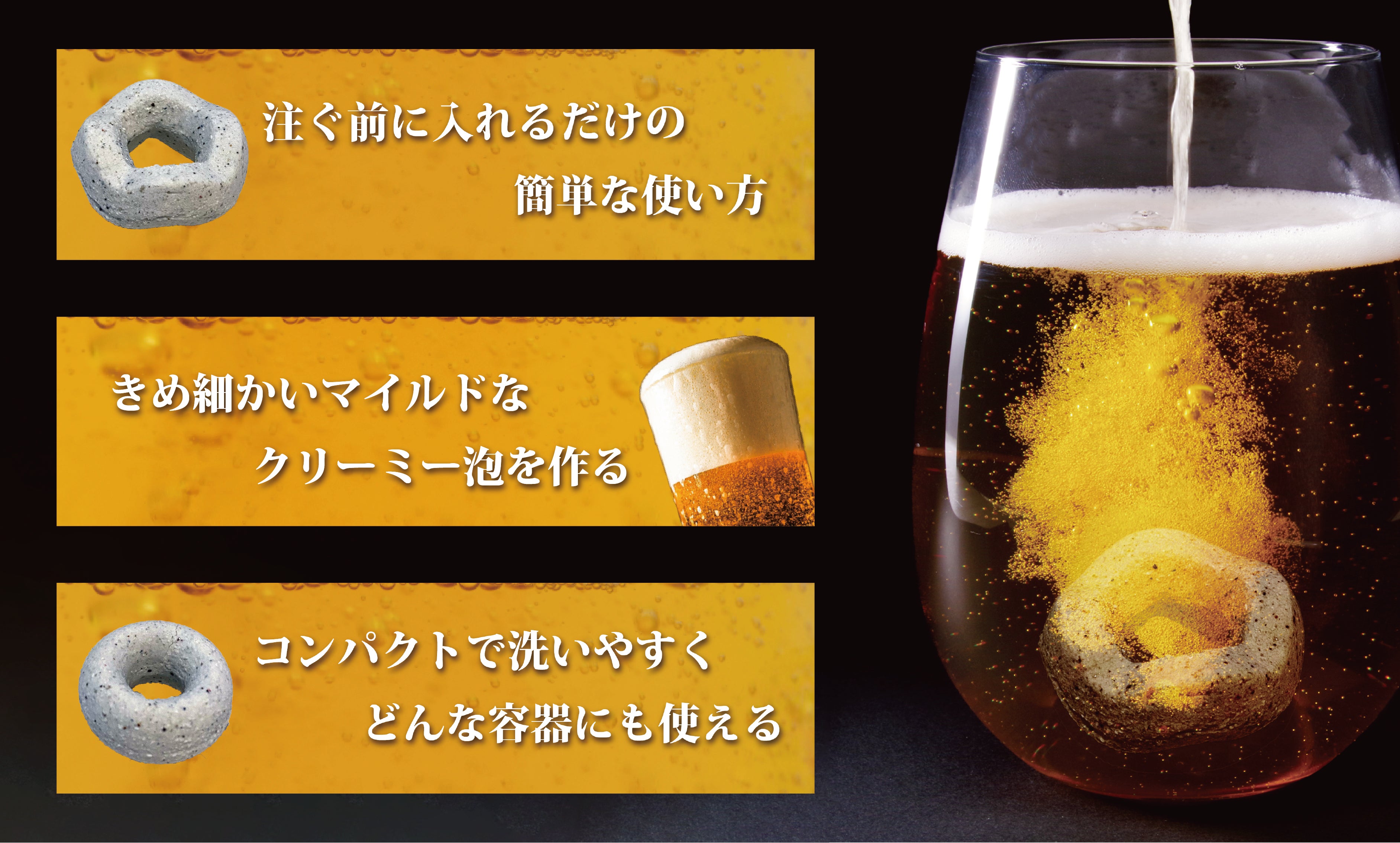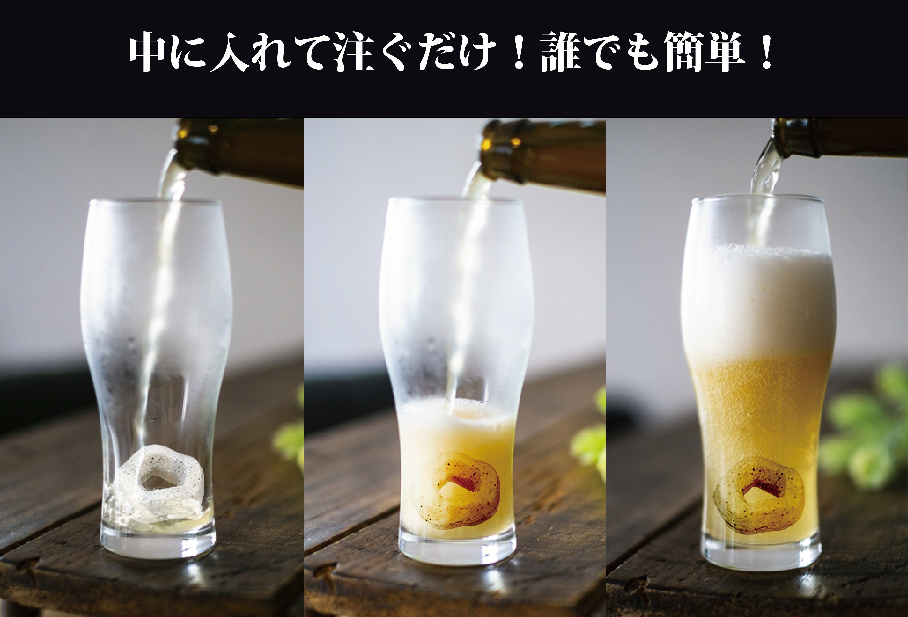 ビアリングはグラスに入れて、ビールを注ぐだけで究極の泡を、飲み終わる最後まで作り出すことができます。
