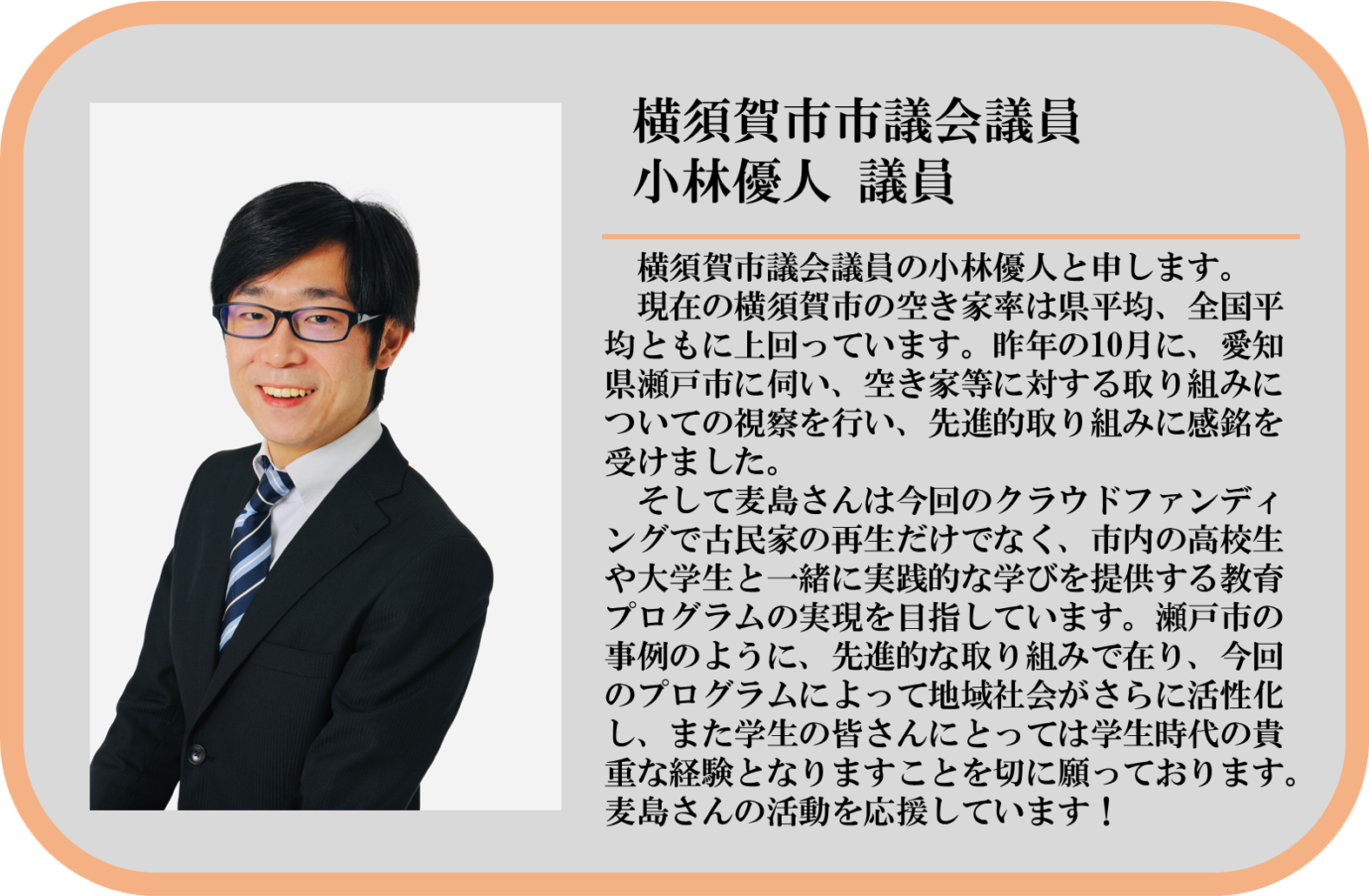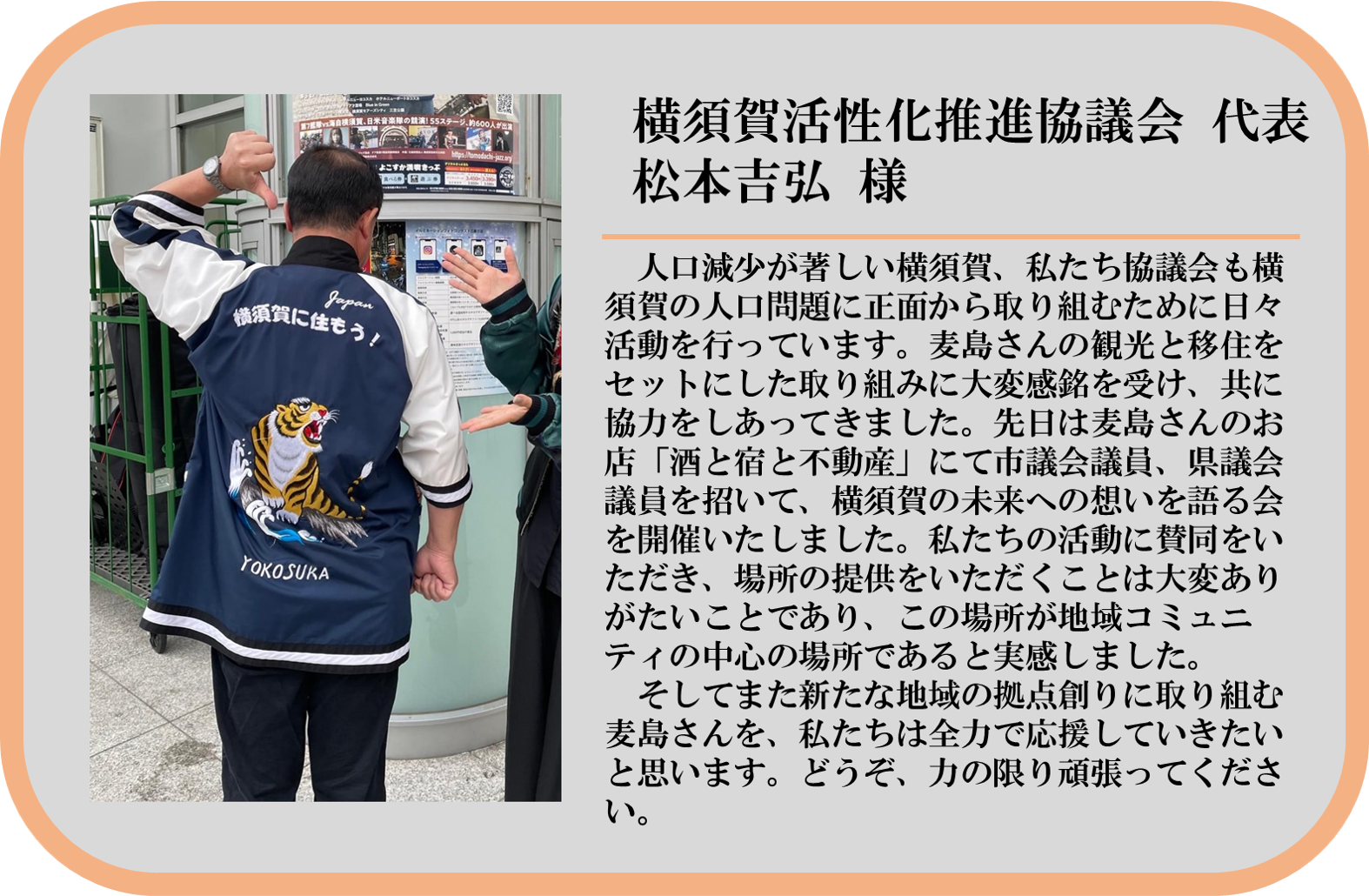 多くの応援をいただいてこのプロジェクトは始まりました。みんなそれぞれ地元横須賀への愛があふれた方々です。私たちもその一人として、より魅力的で「どうだ、横須賀いいだろ!」と胸を張れる街にしたいと活動しています。これからも多くの方々の助けをいただくと思います。そこから生まれる繋がりや絆を実際に今の若い人にもい感じて成長をしていただきたいです。このプロジェクトはただの空き家改修ではありません。地域の宝である若力を育てるプロジェクトです。こちらをご覧の皆様にも故郷はあると思います。今一度想像してみてください、その故郷に笑顔で暮らす若い力があるところを。私たちはそんな未来を横須賀に創るため、これからも活動していきます。その一歩がこのプロジェクトです。