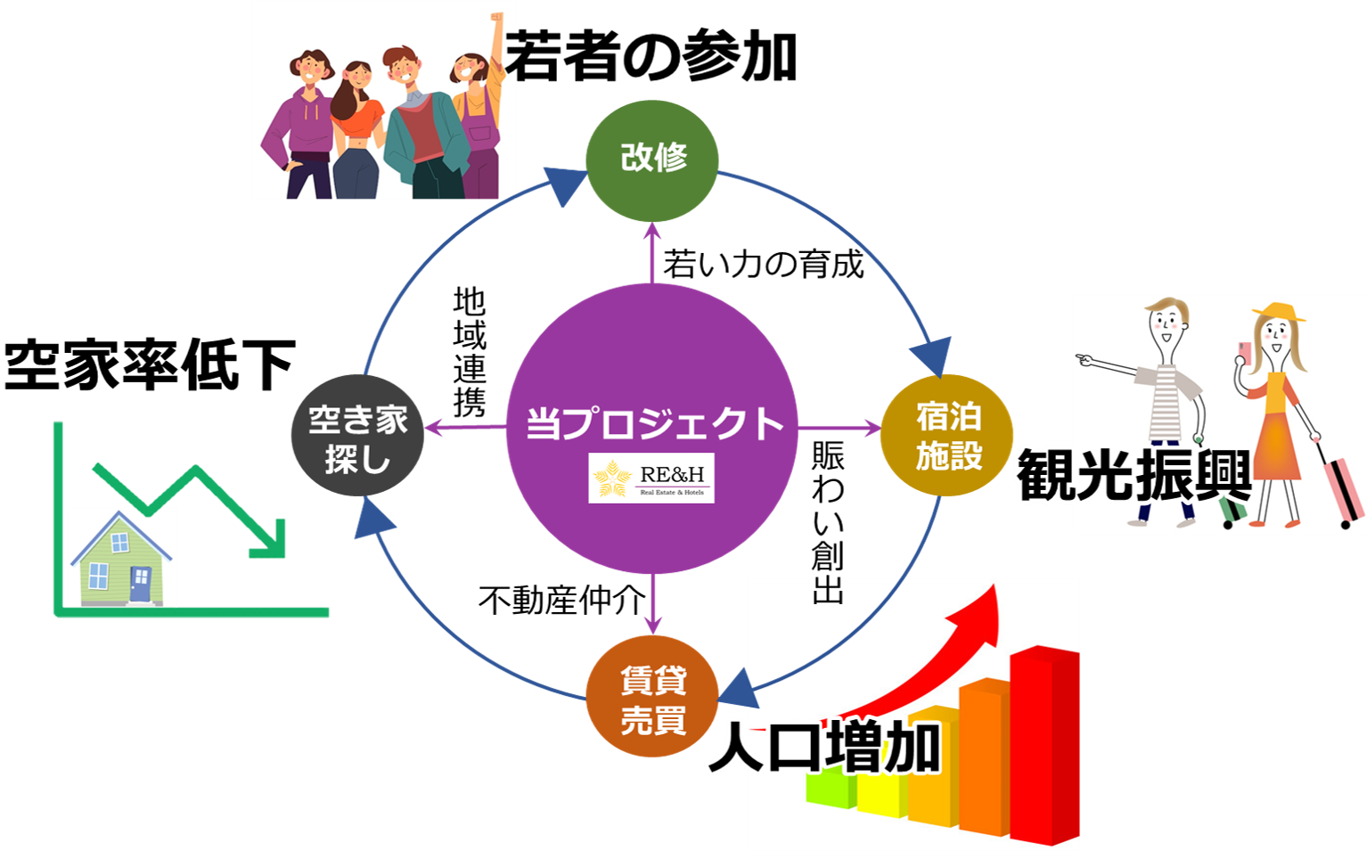 このプロジェクトでは「空き家問題」「人口問題」という地域課題の解決、「観光振興」「若い力の育成」とい地域の魅力を引き出すことへ、大きく力を発揮します。
