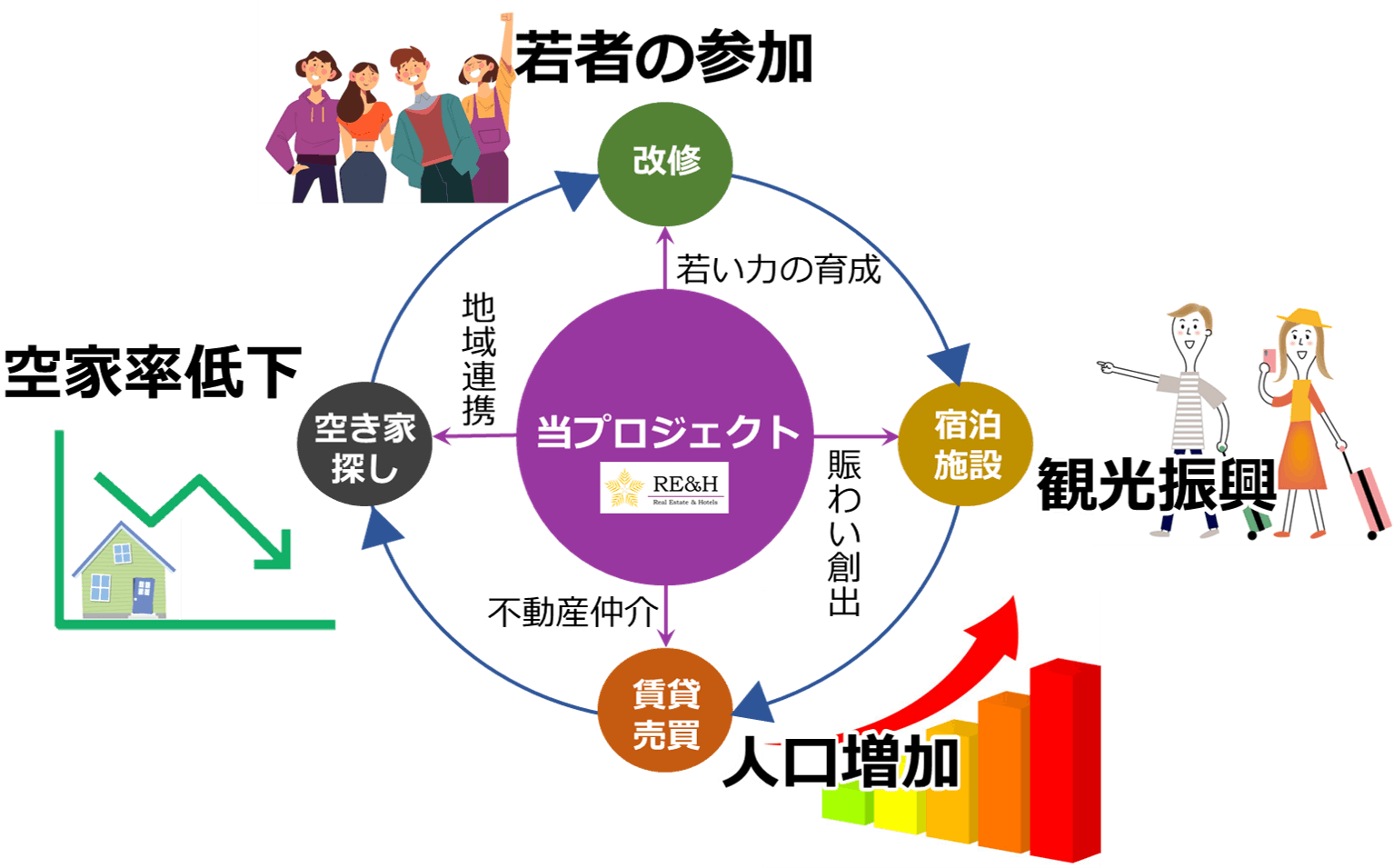 このプロジェクトでは「空き家問題」「人口問題」という地域課題の解決、「観光振興」「若い力の育成」とい地域の魅力を引き出すことへ、大きく力を発揮します。