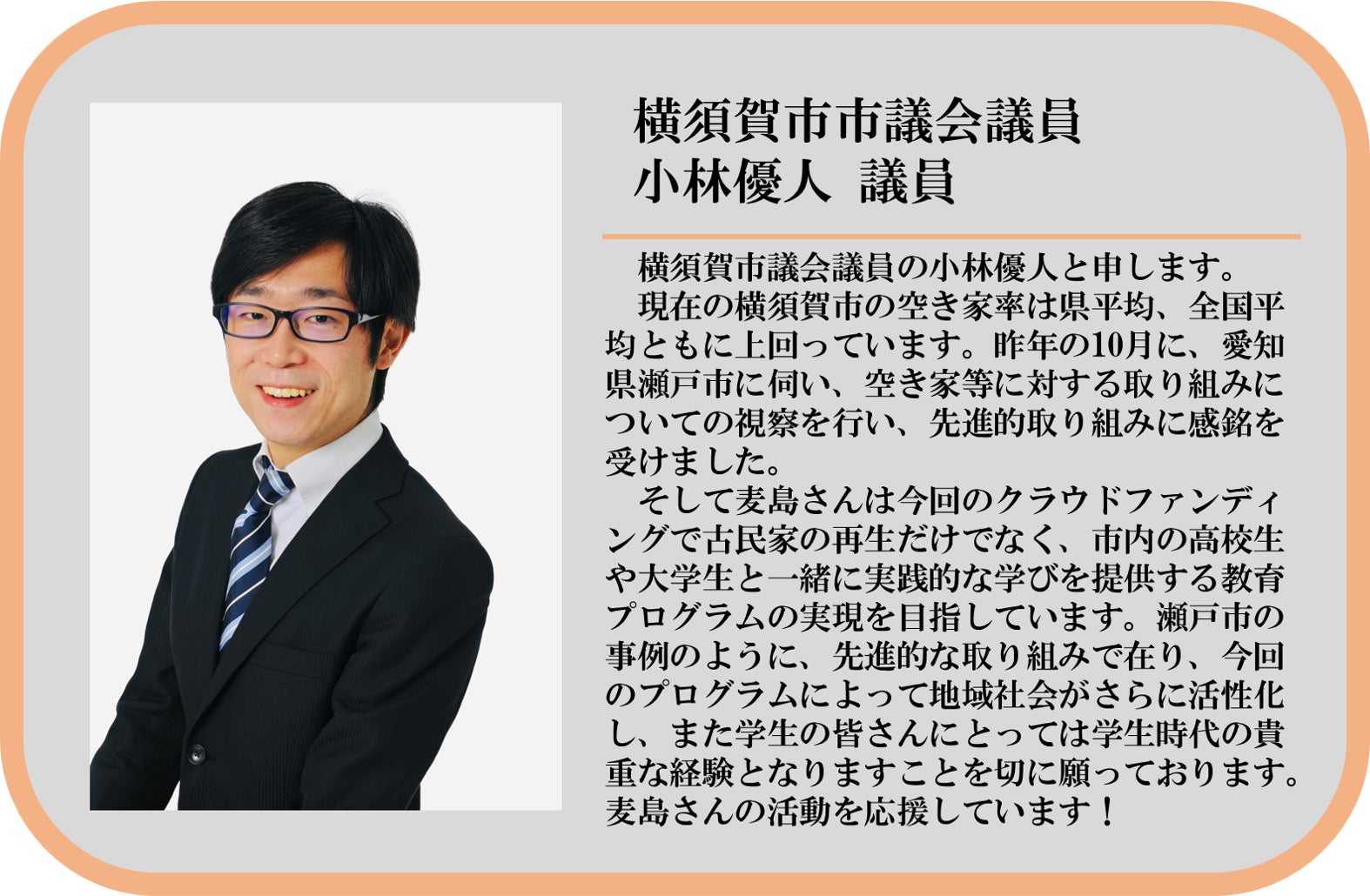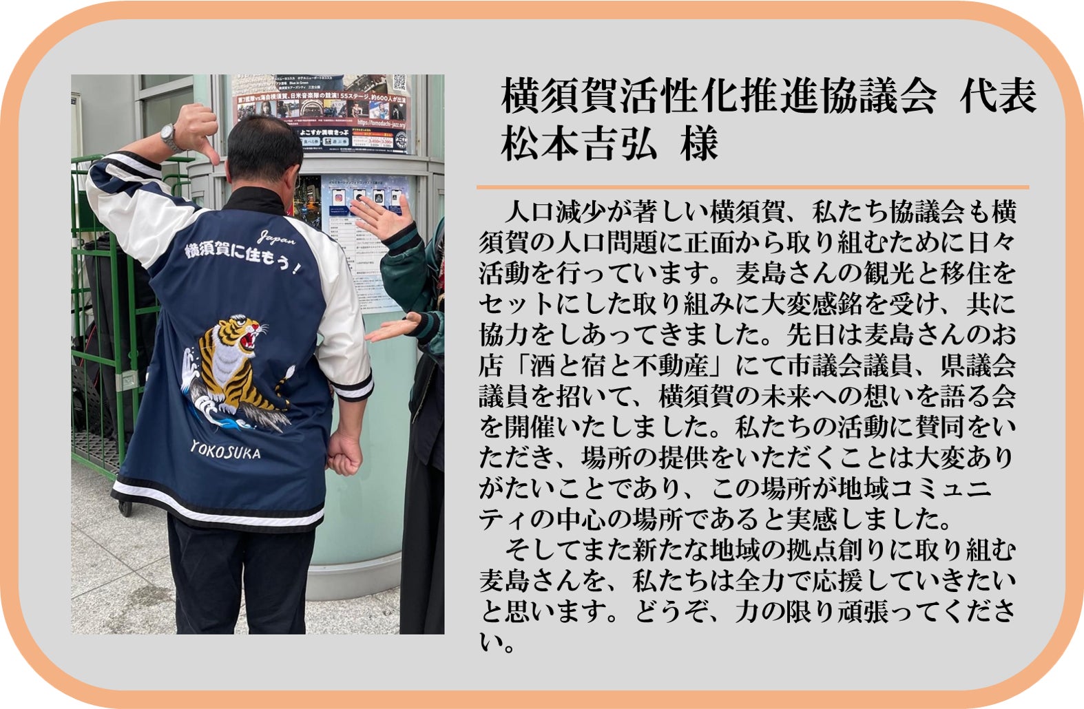 多くの応援をいただいてこのプロジェクトは始まりました。みんなそれぞれ地元横須賀への愛があふれた方々です。私たちもその一人として、より魅力的で「どうだ、横須賀いいだろ!」と胸を張れる街にしたいと活動しています。これからも多くの方々の助けをいただくと思います。そこから生まれる繋がりや絆を実際に今の若い人にもい感じて成長をしていただきたいです。このプロジェクトはただの空き家改修ではありません。地域の宝である若力を育てるプロジェクトです。こちらをご覧の皆様にも故郷はあると思います。今一度想像してみてください、その故郷に笑顔で暮らす若い力があるところを。私たちはそんな未来を横須賀に創るため、これからも活動していきます。その一歩がこのプロジェクトです。