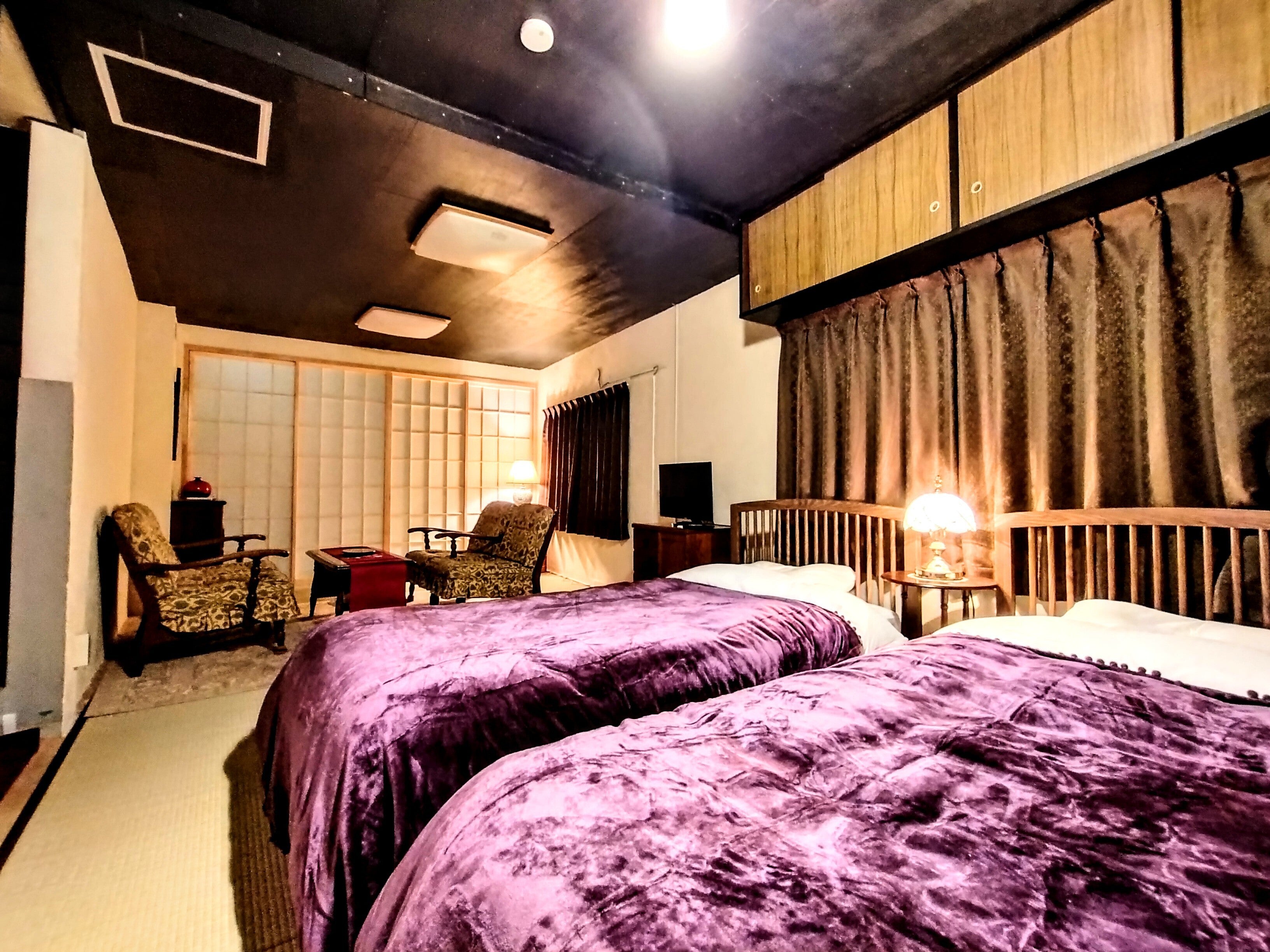 客室も大正浪漫を彷彿とさせるレトロモダンな造り。5名まで泊まれます。