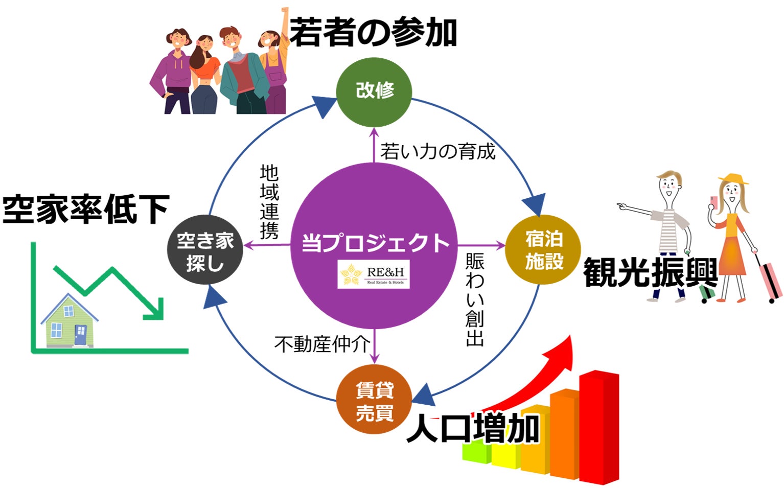 このプロジェクトでは「空き家問題」「人口問題」という地域課題の解決、「観光振興」「若い力の育成」とい地域の魅力を引き出すことへ、大きく力を発揮します。