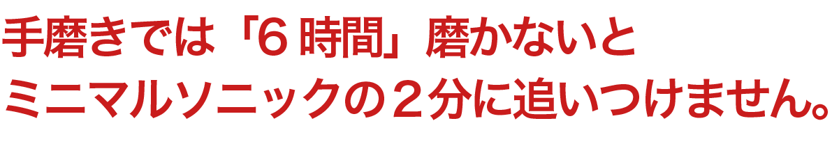 ミニマルソニックは2分間で44,000回磨けますが、手磨きで44,000回磨くには6.1時間も必要です!圧倒的な時短&効率化&生産性アップを実現するミニマルソニックを是非、お試し下さい!
