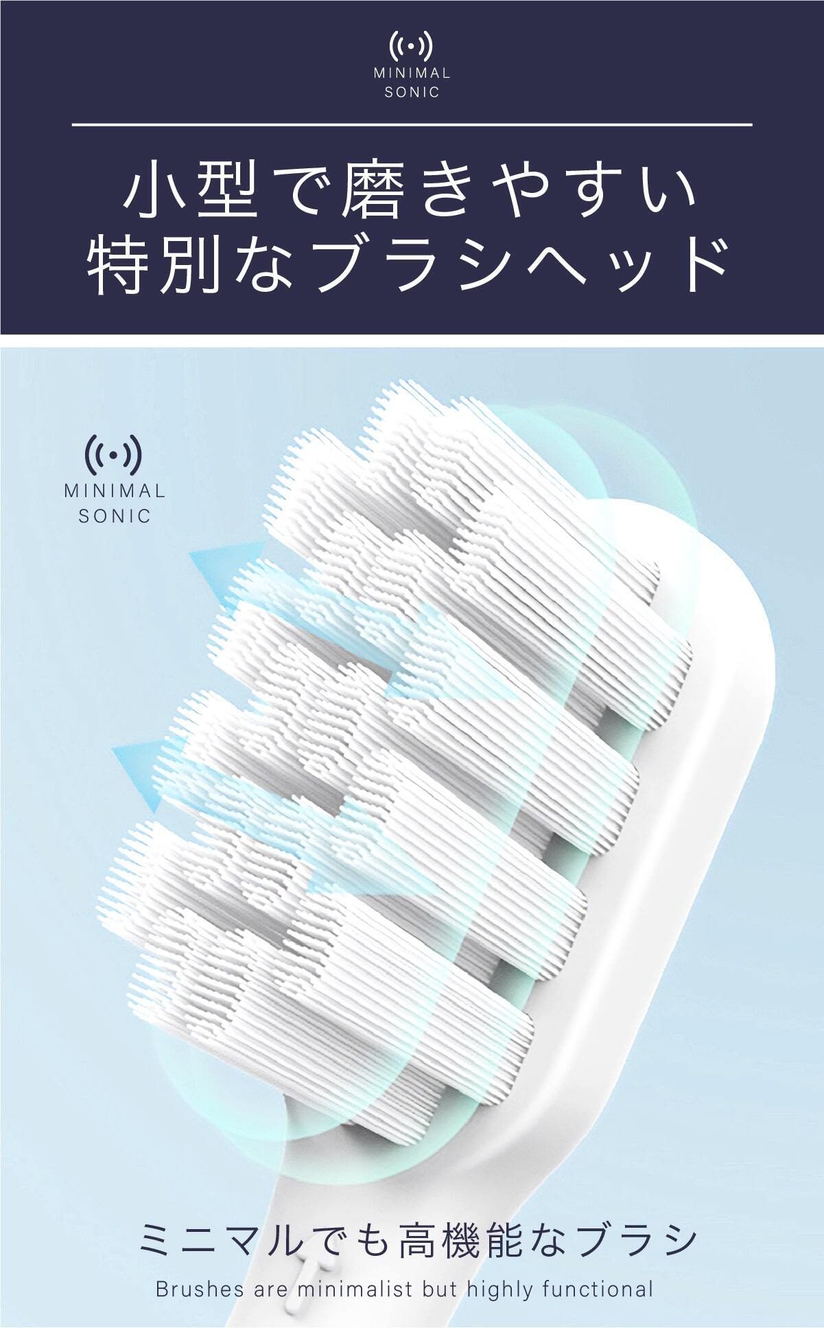 今までの電動歯ブラシを大きいと感じたことはありませんか?普通の歯ブラシから電動歯ブラシに変えた時にそれを大きく感じると思います。電動歯ブラシは構造上、大型化してしまうのですが、常識に囚われずまったく新しい電動歯ブラシを設計したのがこのミニマルソニックです。画期的な構造で小型でパワフル。未来の体験をはじめましょう。