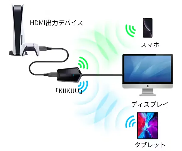 「KIIKUU」とはiOS/Android搭載のスマートデバイスにゲーム機・パソコン・カメラなど、HDMI出力デバイスの映像と音声を同時にワイヤレス伝送可能な世界初※の映像伝送装置です。