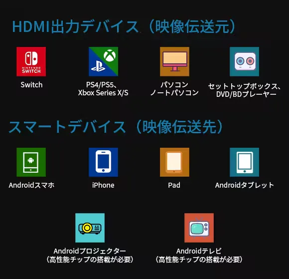 「KIIKUU」は幅広いデバイスに対応しています。伝送元として、ゲーム機などはもちろん、HDMI出力端子搭載の機械であれば、ほとんど伝送可能です!そして、伝送先について、スマホ・タブレットはもちろん、iOS 12.0以降・Android 12.0以降搭載のH.265/HEVC コーデックのハードウェア・アクセラレーションに対応するスマートデバイスであれば、HDMI信号の画面が映せます。