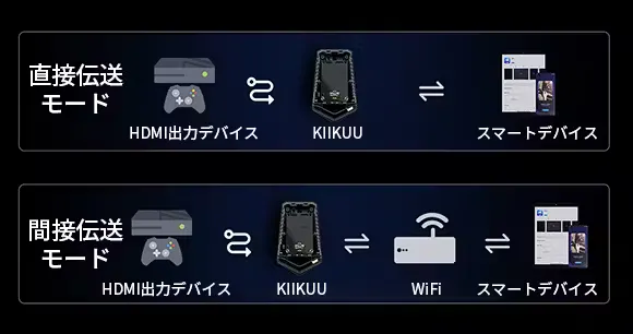 A:①直接伝送は「KIIKUU」自体のWiFi信号を利用し画面をそのWiFi信号に接続しているスマートデバイスに伝送するモードで、遅延が非常に低くなめらかな画面が見られるのが特徴です。しかし、伝送距離は最大25メートル(「KIIKUU」自体のWiFi信号範囲)です。スマートデバイスと「KIIKUU」との間の障害物があると、伝送に悪影響を及ぼす恐れがあります。