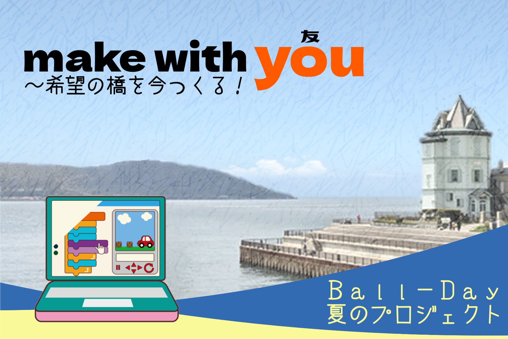 こんにちは。放課後等デイサービスBall-Dayの高橋です。現在、Ball-Dayはお盆休みをいただいておりますが、私は着々と準備を進めております。さて、大変遅くなりましたが、ストーリーが決定しましたので、ご紹介します。6月に話し合いを始めた頃は、昨年のお化け屋敷の設定をなぞるものでしたが、前情報が多すぎて理解に時間がかかってしまうと指摘。その後、中学生の女の子が中心になって、ストーリーとキャラクター設定を。このストーリーを書いた子がタイトル案を提案してくれ、ほかの子たちにはかり、その子たちの意見を踏まえて、スタッフと話し合って決定に至りました。 ・ ・ ・タイトル 【 make with you ~希望の橋を今つくる! 】実はほかの子たちにはかったとき、英語表記を使わない方が人気だったんです。多くのお子さんは「なんとなく」としか答えられないなかで、あるお子さんが「意味が入って来にくい」と。そこで折衷案を提案。今回のイベントのターゲットはあくまで大人であり、作った本人もいいと思う英語表記はそのままに、当初のサブタイトル「希望の橋を」を、念押しする意味で「希望の橋を今つくる!」に変更しました。ちなみに、Youにこだわりがあるそうです。「友」「結う」「優」と、このプロジェクトに積極的に関わっている子の名前を入れ込みたいとのこと。内容を的確に伝えるものであり、すごく思いのこもったタイトルになりました。 ・ ・ ・【ストーリー】*フィクションです。これは、私たちが毎日当たり前のように見ている橋にまつわる物語です。淡路島にかしまゆいという女の子が住んでいました。彼女は物心ついた頃から人と面と向かって話をすることが苦手で、友達はいませんでした。ゆいの楽しみは、音楽家の父の影響で始めたピアノ。学校から帰宅すると毎日ピアノに向かっていました。みるみる上達したゆいは父から発表会に出ないかとすすめられました。来る日も来る日も練習に明け暮れたゆい。発表会は大きなフェリーで海を渡った垂水で開かれました。練習の成果と絶対に大丈夫と信じ続けてくれた父が励みとなり、演奏は大成功。演奏のあと、ゆいは3人の女の子と出会いました。月菜・鈴華・静奈は会場近くに住む同い年の女の子です。親しくなったゆいと3人は文通をすることになりました。3人が好きだった絵の世界にゆいは浸っていきました。手紙を重ねるにつれて、4人には一つの思いが湧いてきたのです。私たちの町と町を隔てる海峡に橋を作って、毎日会いたい、毎日お話がしたいと。デザインが得意な鈴華を中心に橋の設計をはじめ、たくさんの人を巻き込んだ橋づくりが始まったのです。さあ、友情で結う希望の橋を、あなたも一緒に作りましょう。 ・ ・ ・このストーリーをもとに、次の3つのゲームで構成していきます。①資材あつめ(キャッチゲーム)②資材を守れ(音ゲー)③橋脚組み立て(テトリス)①については、スクラッチでやっている子たちが、ちょっとやっては試して、意見を出し合って高めています。②は、もともとプログラミングができる子が作っています。③は構成が難しいことから、スクラッチの共有サイトからデータをお借りして、背景などを私たちなりにアレンジする形で進めております。***発表の日まで残り数日。どこまで精度を上げられるかまだまだ分かりませんが、がんばりますので、ぜひ、見学に、いえ、橋づくりに来てください。8月25日(金)午後7時すぎ新多聞センター街・コープ新多聞店前お待ちしています!