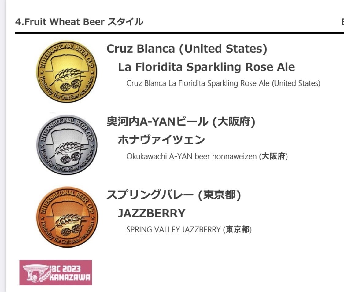 2023/10/02 16:53【International Beer Cup 2023】https://www.beertaster.org/世界で 3 番目に長い歴史を持つ(毎年開催されるものでは最も長い)、世界五大ビール審査会の一つに数えられるビール審査会でA-YANビールのホナヴァイツェンが Fruit Wheat Beer スタイルで銀賞獲得しました。https://www.facebook.com/beerfes.jp感慨深いです!!いつも応援していただいている皆様、製造元のセンターポイントの皆様、本当にありがとうございます。今後とも河内長野の地産品をいれたビールを世界中に広めていけるよう努力していきます!! もっと見る