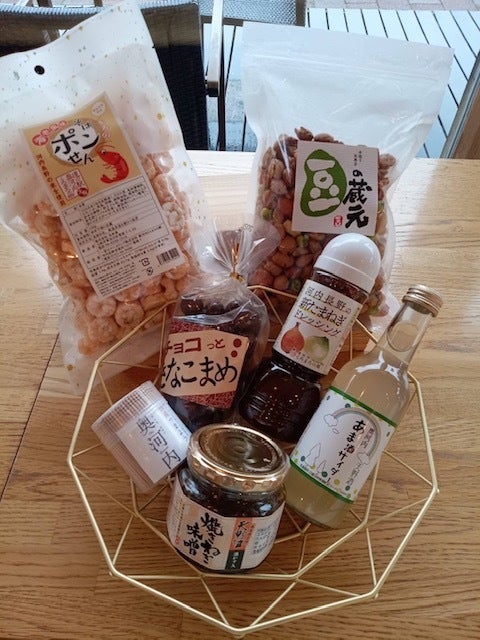 内容:よりどりみどり、チョコっときなこ豆、河内長野産新玉ねぎドレッシング、そばぽんせん、奥河内甘酒サイダー、焼きねぎ味噌(天野酒/西條合資会社)、しらかば楊枝(菊水産業)(大)