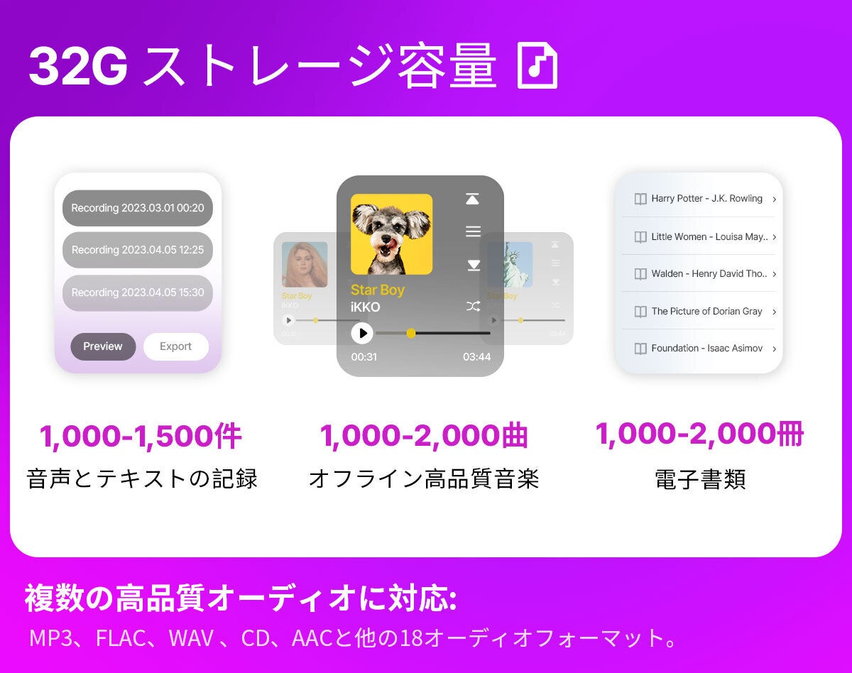A:CAMPFIREバージョンの場合、充電ケースには内蔵の32GBメモリがあり、MP3、FLAC、WAV、CD、AACなど、さまざまな高音質の音楽形式をサポートしています。この容量では、高品質の音楽ファイル500〜2000曲、音声とテキストの記録100件(10分間)、e-book 5,000〜20,000冊を保存することができます。ActiveBudsのご利用をお楽しみいただければ幸いです!