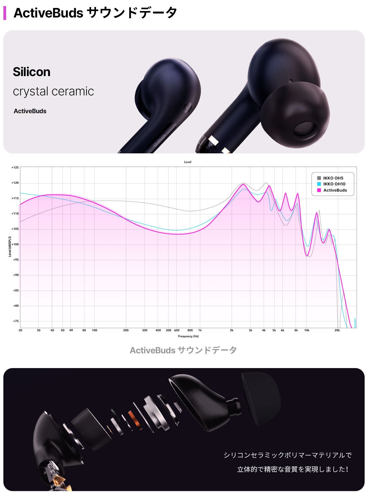 ActiveBudsは、高級なシリコンクリスタルセラミック素材を採用し、優れた音響体験を提供します。この高級素材により、クリアで繊細な音質を実現しています。