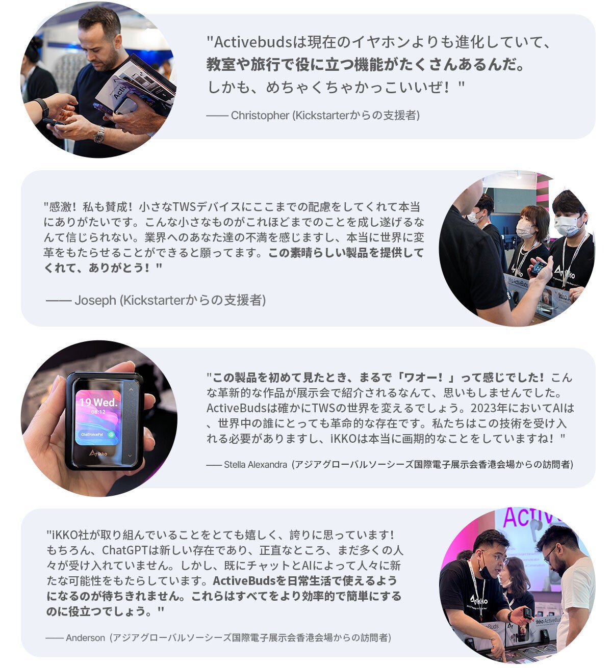 この展示会は日本でActiveBudsの初めての公開です。展示会にお越しいただき、ActiveBudsに対する第一印象やフィードバックをお聞かせください。
