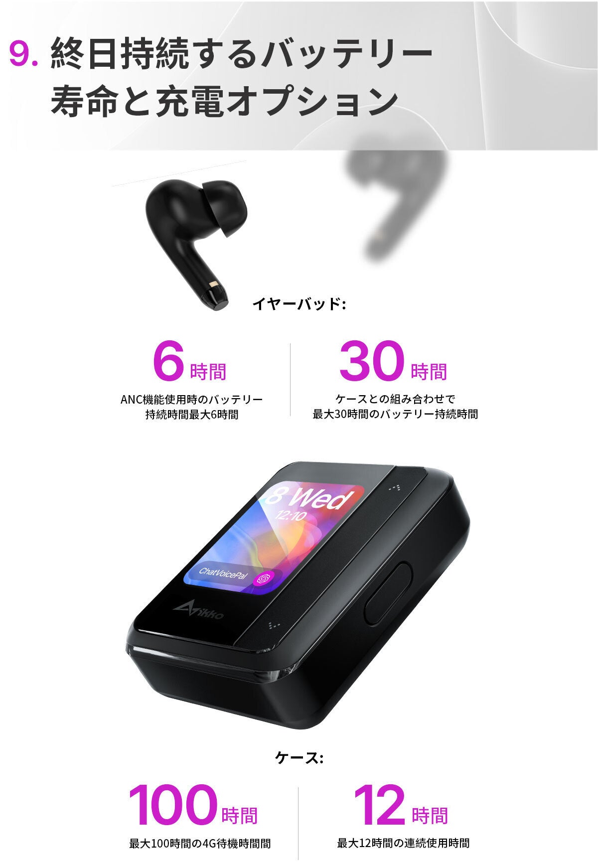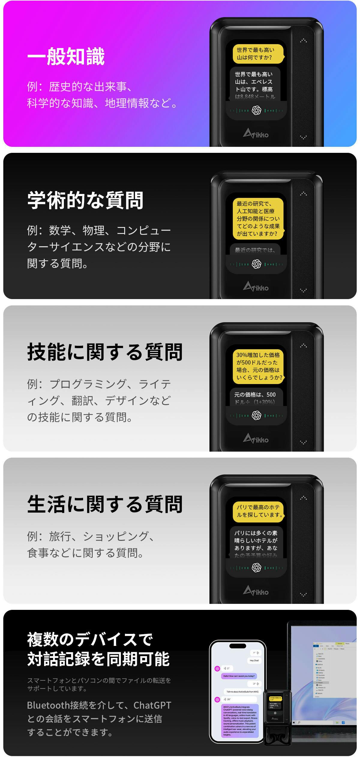 まず、ChatGPTによる音声対話会話が可能です!さらに、40言語のリアルタイム翻訳や音声からテキストへの変換もできるんですよ!さらにさらに、健康管理機能やSpotifyオンライン音楽の再生、オンライン音楽のストレージ、自己調整EQなど、まさに万能のデバイスなんです!そしてなんと言っても、独立した4G/WIFI接続が可能なんです!