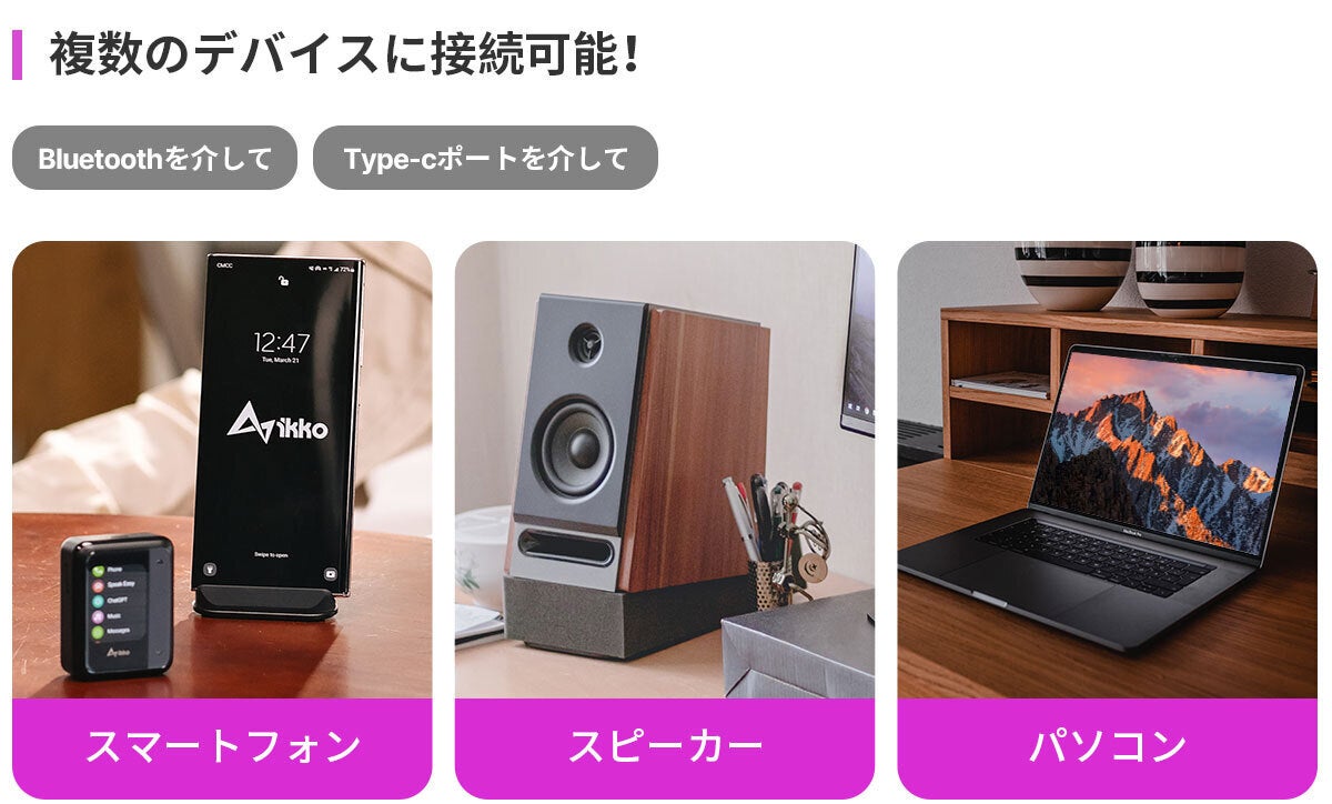 ① Bluetoothでスマートフォンの接続:iKKOのモバイルアプリを使用して、ファイルや音楽の転送、個人情報の設定、ケースのテーマや背景のカスタマイズなどが可能です。