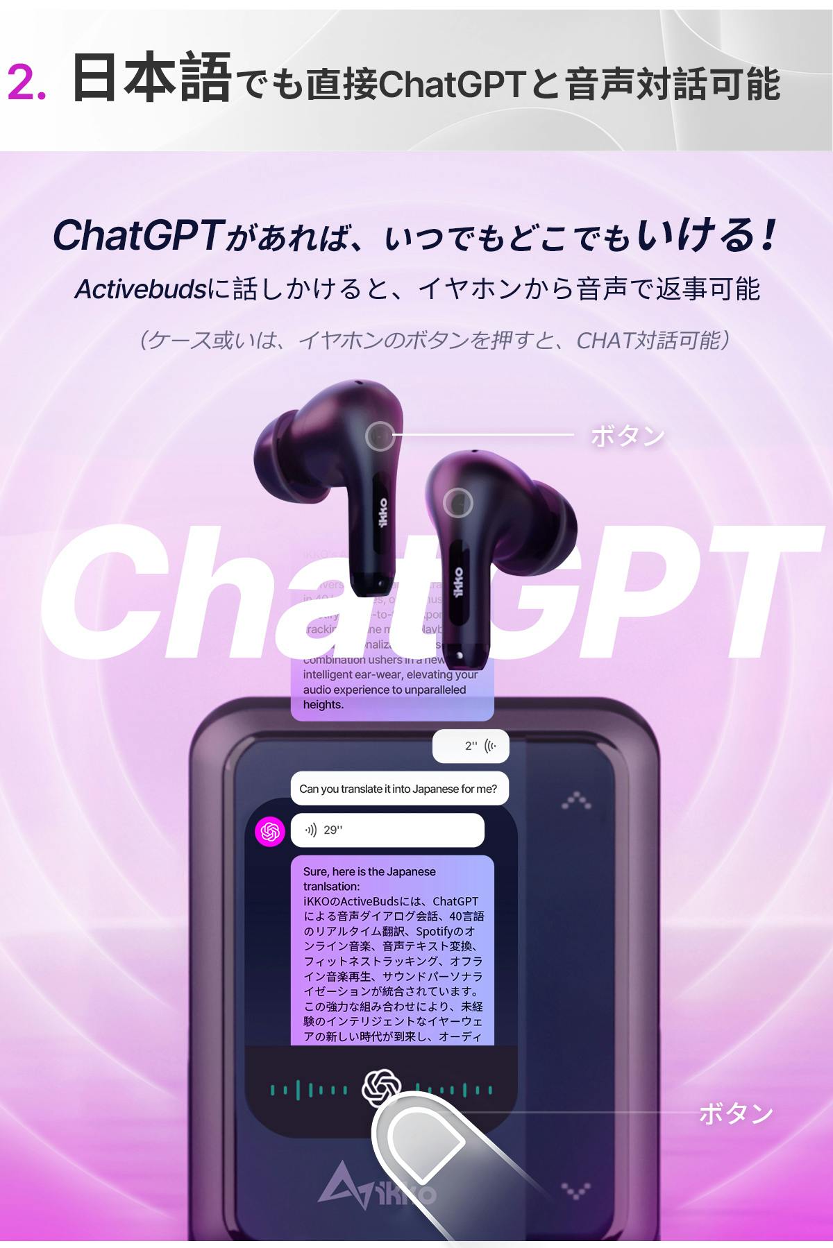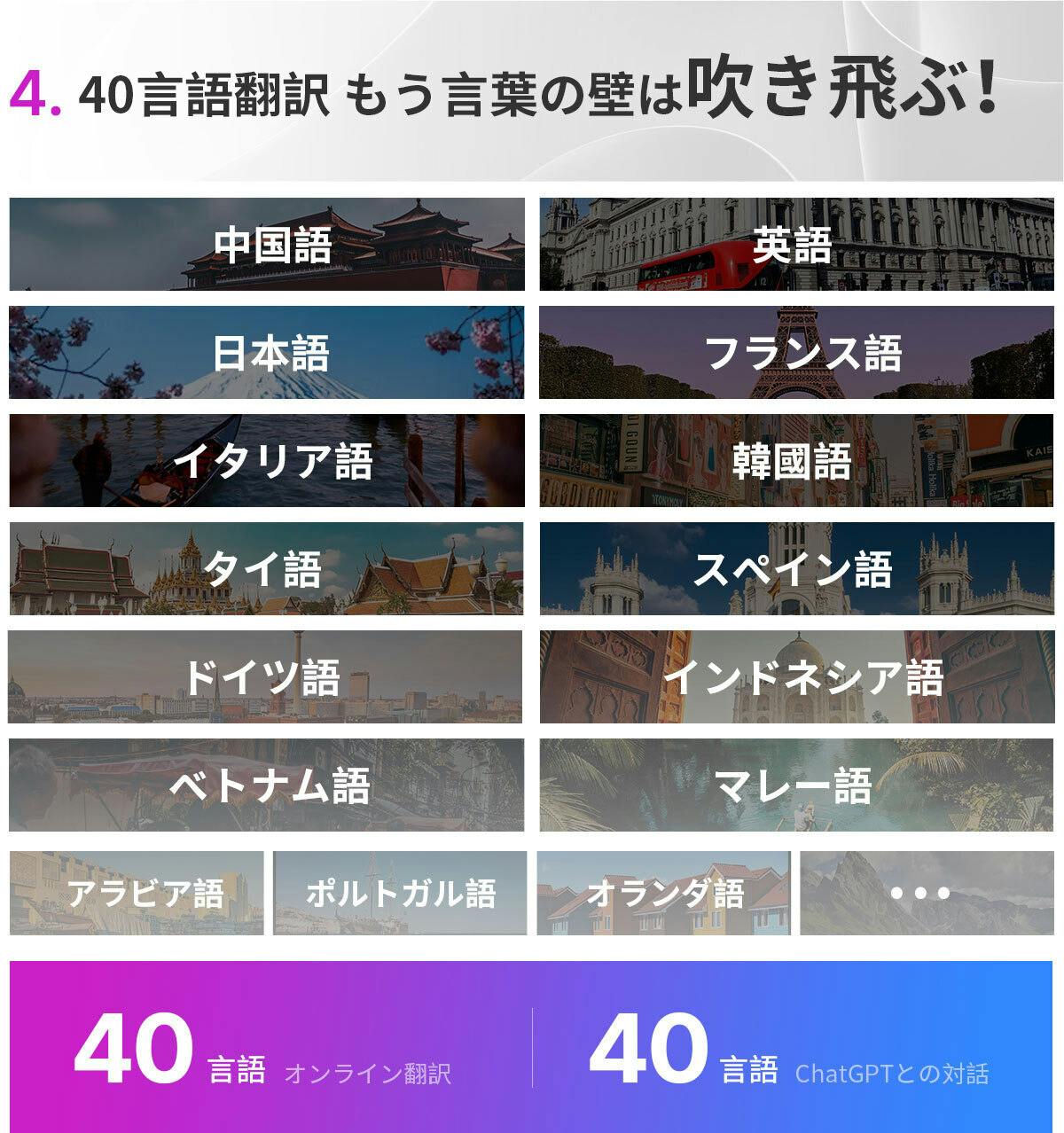 - ActiveBudsは40種類のデフォルト言語を提供しており、自分にとって最も使いやすい言語でChatGPTとコミュニケーションを取ることができます。