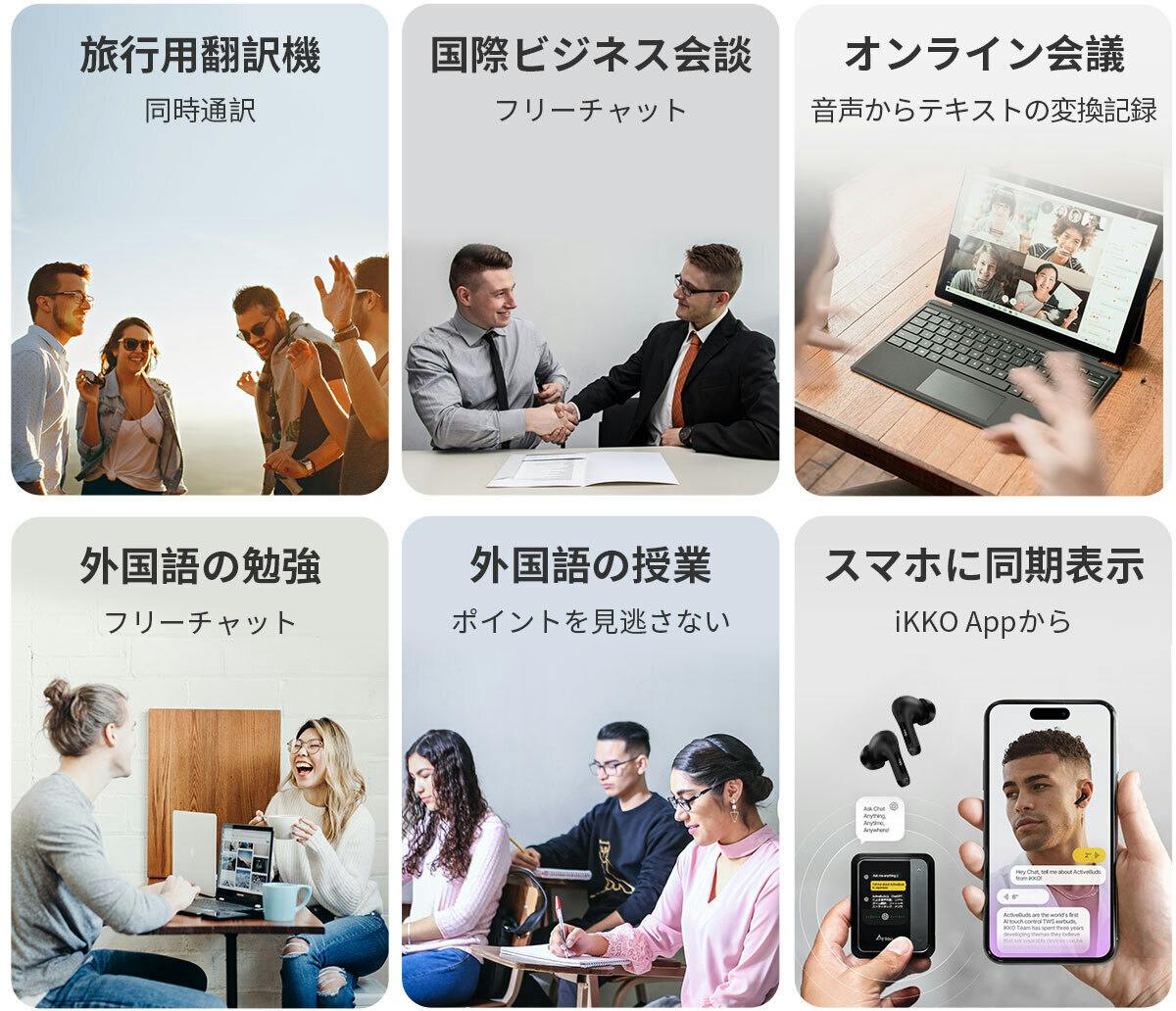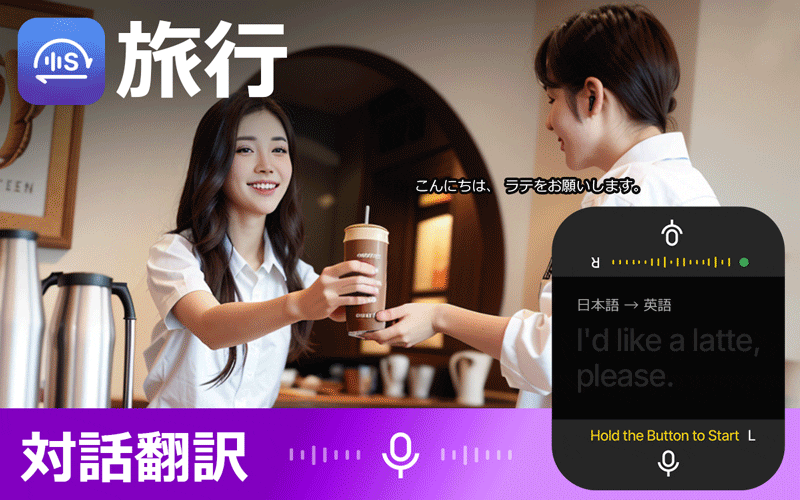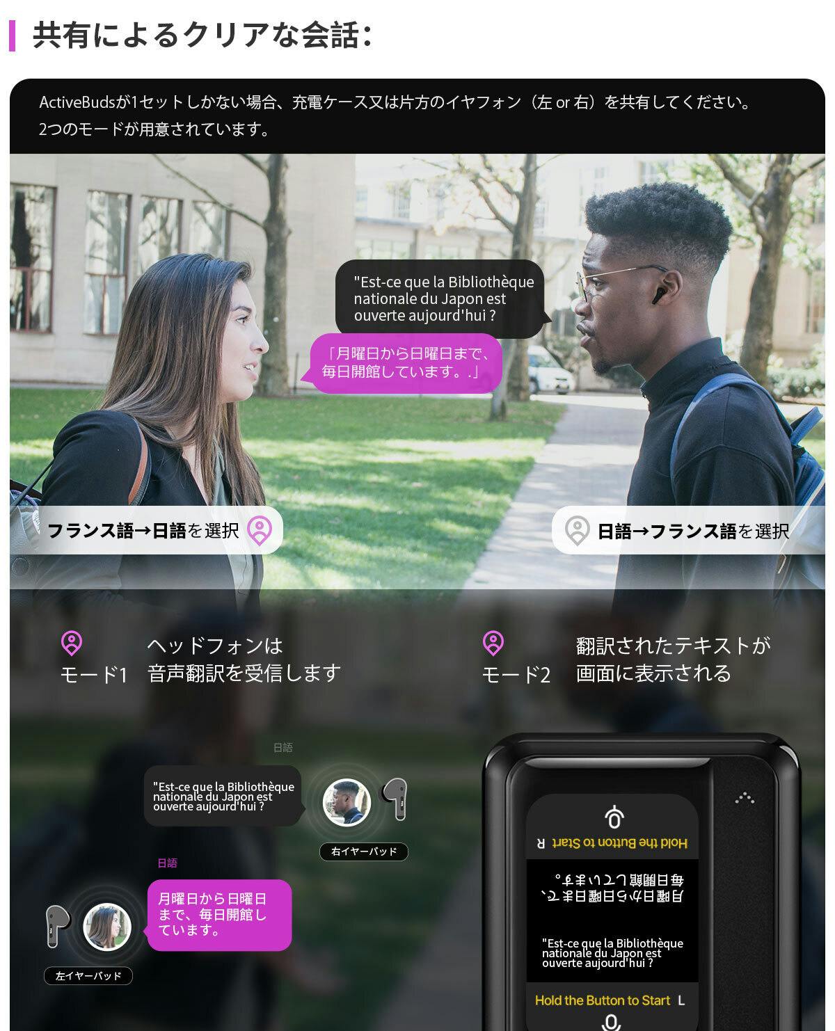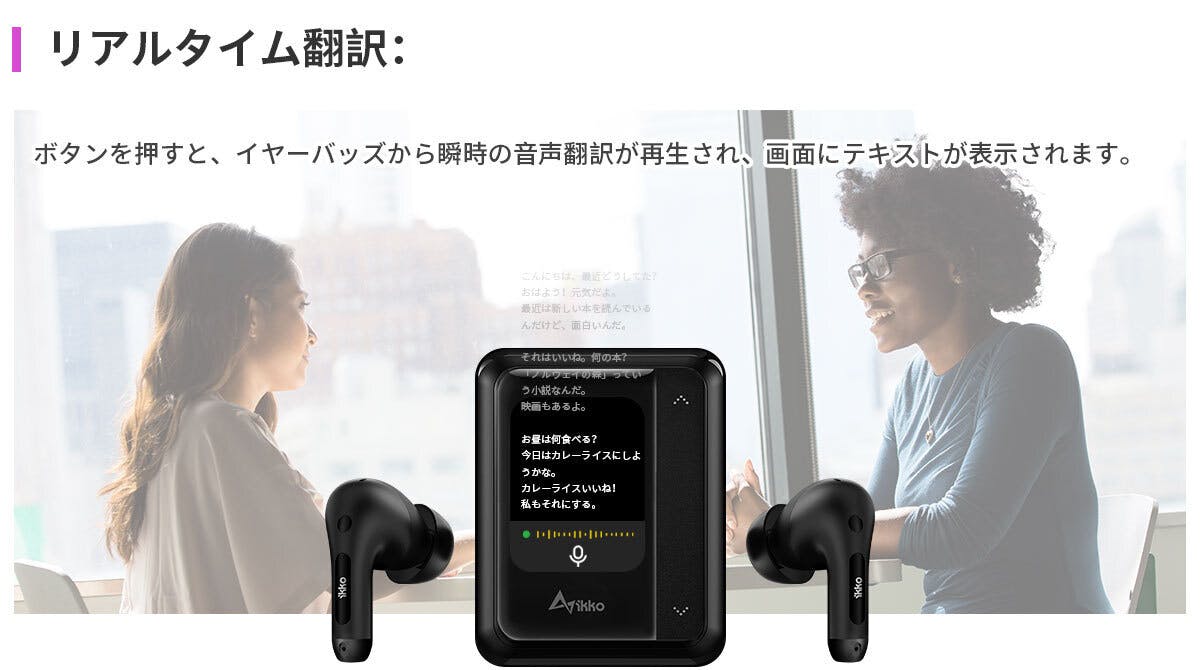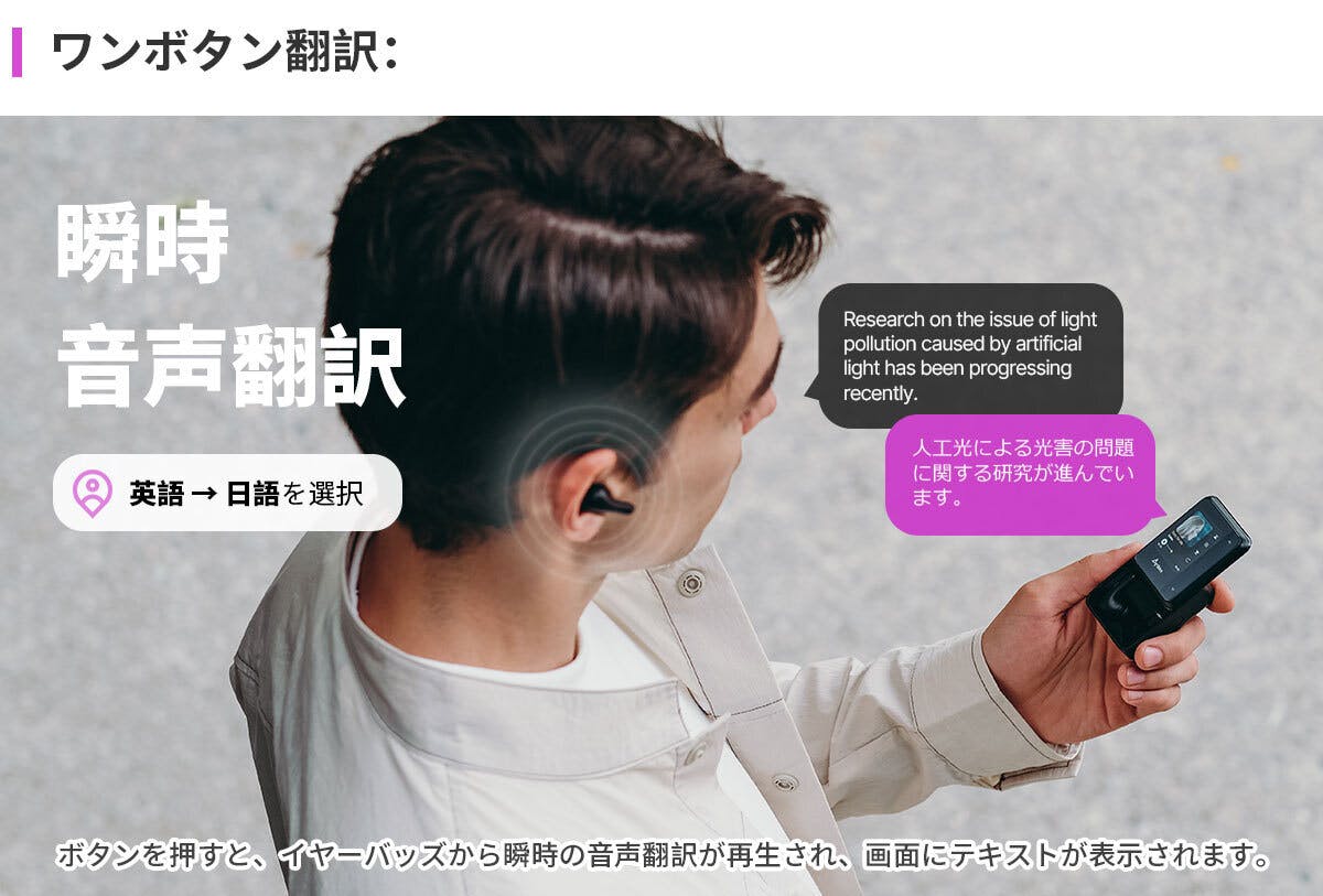 ボタンを押すと、イヤーバッズから瞬時の音声翻訳が再生され、画面にテキストが表示されます。