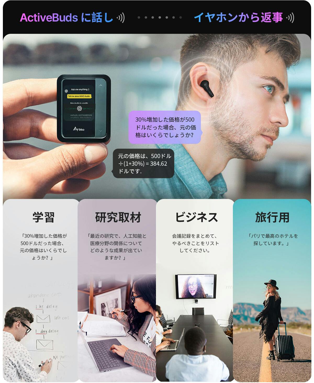 ActiveBudsは、CHATGPTとのシームレスな音声対話ができ、質問応答の形式でコミュニケーションを実現します。まるで個人秘書が耳元にいるかのように、様々な生活、仕事、学習の問題を解決するお手伝いをします。