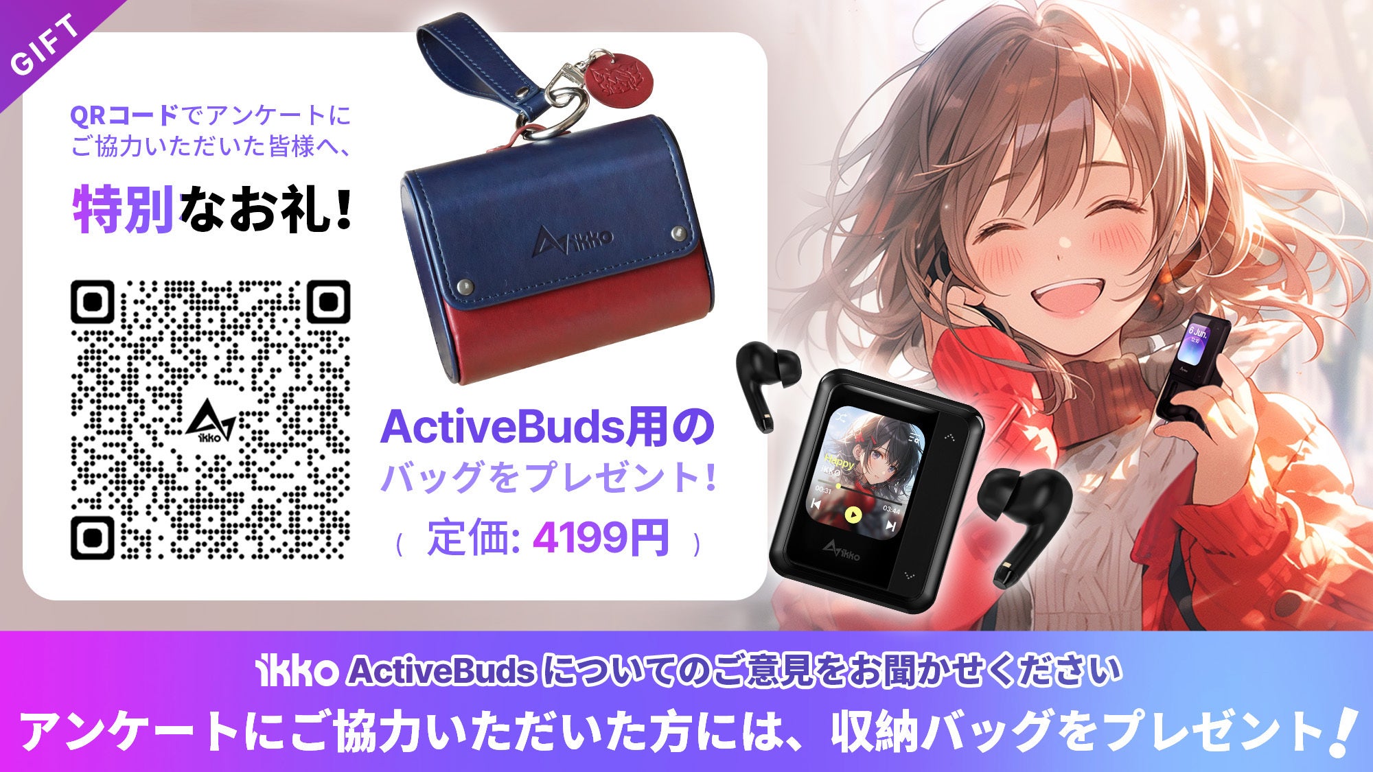 QRコードでアンケートにご協力いただいた支援者の皆様へ、特別なお礼をご用意しました!前回のプレゼントに加えて、ActiveBuds用のバッグも差し上げます!