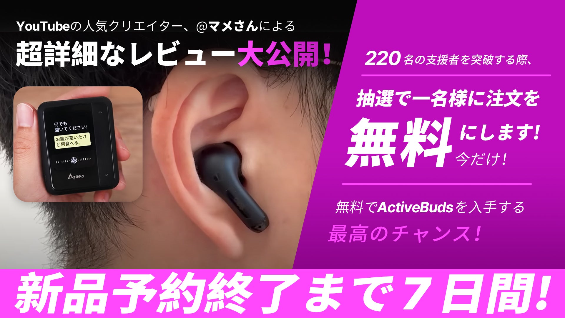 皆さま、大変お待たせしました!抽選結果を発表します!幸運な方、kajuu120様へお知らせです!あなたは無料でActiveBudsを手に入れることができる選ばれた方です!返金手続きについては、CAMPFIREメッセージまたはメールでお知らせいたしますので、ご確認ください。心からおめでとうございます!この素晴らしい機会を掴んでいただきました。kajuu120様の応援とサポートに感謝申し上げます!また、皆さんのお陰で、ActiveBudsの先行予約が大成功となりました!心から感謝申し上げます!リターンの発送は9月を予定しておりますので、お楽しみにお待ちください!皆さんの期待と熱意に感謝致します!これからも製品の生産と運送状況の進捗や特典情報をお届けしますので、楽しみにしていてくださいね!引き続き、皆さまのご支援に心から感謝しています。次なる報告もお楽しみに!Facebookグループ:https://www.facebook.com/groups/ikkotechActiveBuds専用のTwitter:https://twitter.com/ikko_techiKKOブランドのTwitter:https://twitter.com/ikko_Audio公式ウェブサイト: https://www.ikkoaudio.comどうぞよろしくお願いいたします。