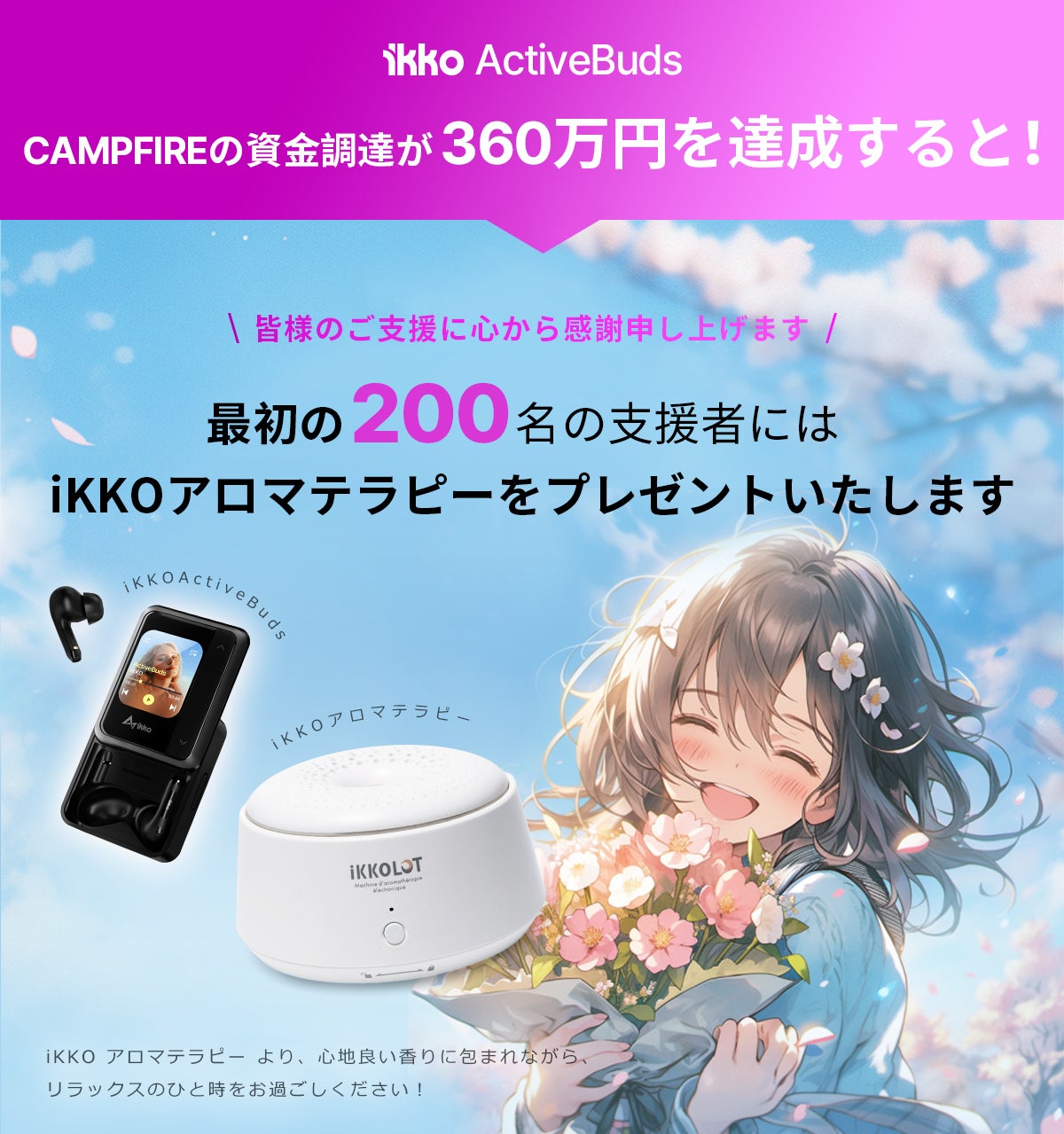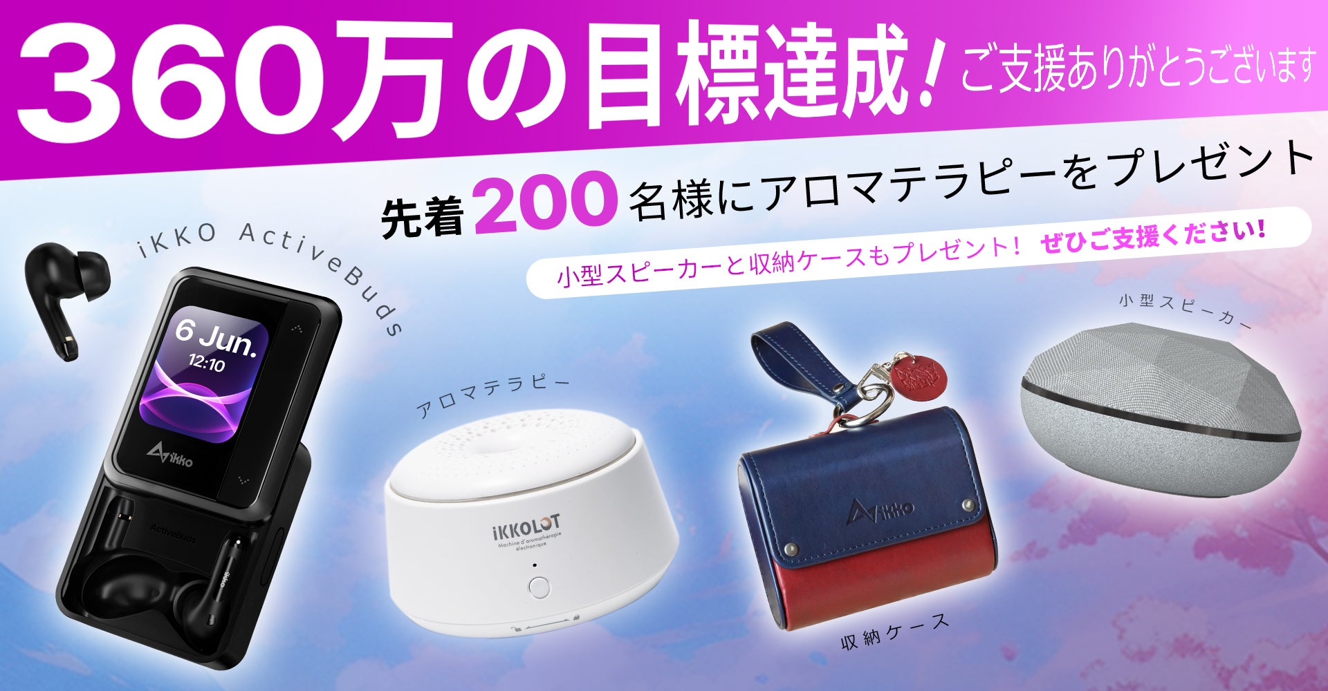 皆様、こんにちは!このたびは、ActiveBudsプロジェクトの五回目の活動報告をお届けいたします。大変嬉しいお知らせがあります!なんと、360万円の目標達成に成功しました!この節目の達成に感謝の気持ちでいっぱいです。目標達成を記念し、アロマテラピーのギフトを解禁いたしました!前回お伝えした通り、前200名の支援者の皆様には、特別な贈り物としてiKKOアロマディフューザーをお届けいたします。心地よい香りとともに、感謝の気持ちをお伝えしたいと思います。また、皆様のご要望にお応えして、日本語の取扱説明書と操作ガイドのビデオをご用意いたしました。これにより、より簡単にActiveBudsの操作や機能をご理解いただけるようになります。初めてご利用いただく方も、安心してご使用いただけます。下記画像中のQRコードから是非日本語の取扱説明説明書をご覧ください!ActiveBuds操作ガイドのビデオを大公開!今後も皆様にご満足いただけるサポートを提供するために、新しいサポートコンテンツの開発にも力を入れています。ご購入いただいた方々がActiveBudsを最大限にお楽しみいただけるよう、豊富な情報と使い方のコツをお届けいたします。この度の目標達成とアロマテラピーのギフト解禁は、皆様の温かいご支援のおかげです。心からの感謝を込めて、今後もより良いプロジェクト運営に努めてまいります。引き続きのご支援とご声援をいただければ幸いです。ActiveBudsプロジェクトをより一層盛り上げ、素晴らしい音楽体験を共有しましょう!Facebookグループ:https://www.facebook.com/groups/ikkotechActiveBuds専用のTwitter:https://twitter.com/ikko_techiKKOブランドのTwitter:https://twitter.com/ikko_Audio公式ウェブサイト: https://www.ikkoaudio.com心からの感謝を込めて、ご報告させていただきました。