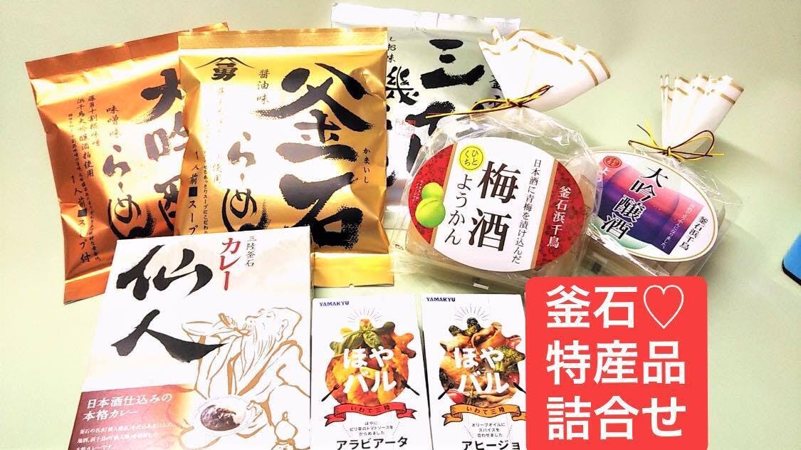 〈 釜石ラーメン 3種類各1袋、浜千鳥酒ようかん 2種類各1袋(0.7%未満のアルコールが含まれます。)、ほやバル 2種類各1缶 、仙人カレー 1箱 〉 + 「釜石のお菓子セット」〈 ほたてせんべい 2枚入れ×3袋(新沼菓子舗)、若鮎焼き×2袋、ラグビーパイ×2袋(小島製菓)、ラガーボール×1袋、はね虎サブレ 2枚入れ×1袋(洋菓子モンド) 〉