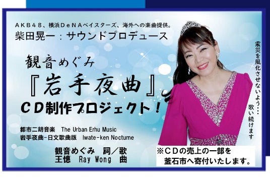 2011年から習い始めた中国楽器・二胡のご縁で、「岩手夜曲」との出会いがありました。「岩手夜曲」は、東日本大震災を悼んで作られた二胡曲です。 ご指導いただいてます陳為(チンイ)先生と、この曲を作曲された、二胡演奏家・作曲家・都市二胡音楽のパイオニアでいらっしゃいます、王憓(レイ・ウォン)氏から、この曲に詞を書いてみませんか?そして歌いませんか?と、有難いお話があり、詞を書かせていただきました。被災地釜石市出身ということもあり、この曲との不思議なご縁を感じました。
