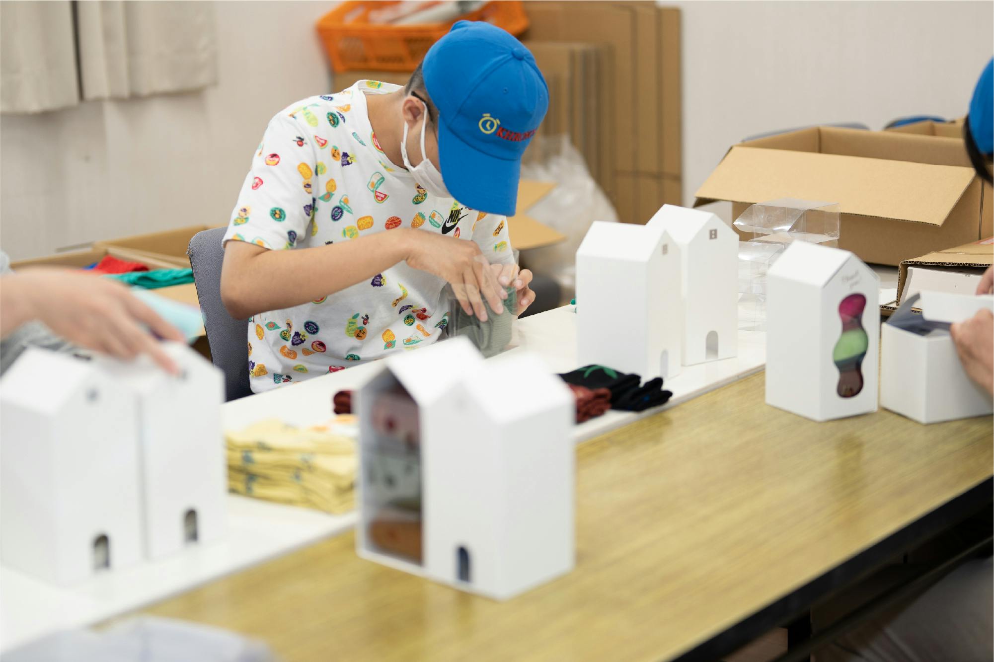 このギフトボックスは、透明のケースに一足ずつ靴下を詰めるデザイン。ゆえに靴下の柄ごとに、いちばん素敵に見える向きと折り方で、丁寧に箱詰めすることが求められます。梱包の一手間によって、ギフトとしてのクオリティが変わるのです。