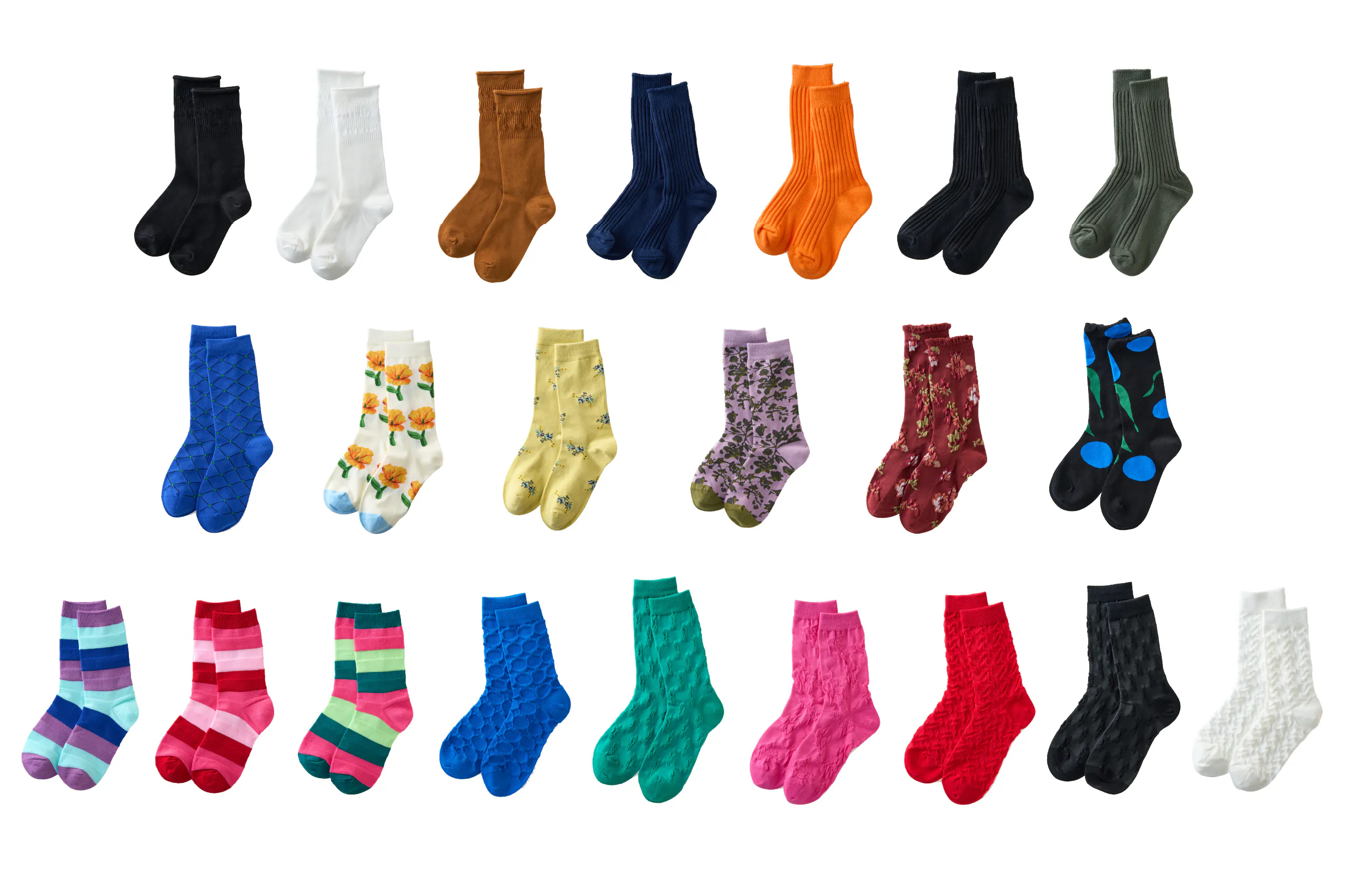 全22種類の靴下は、靴下マニアのバイヤーが、膨大なサンプルの中から厳選した渾身のラインナップ!シンプルな単色から華やかな柄物まで様々。もちろん品質にもこだわりました。贈る人を想って3足を選んでみてください。