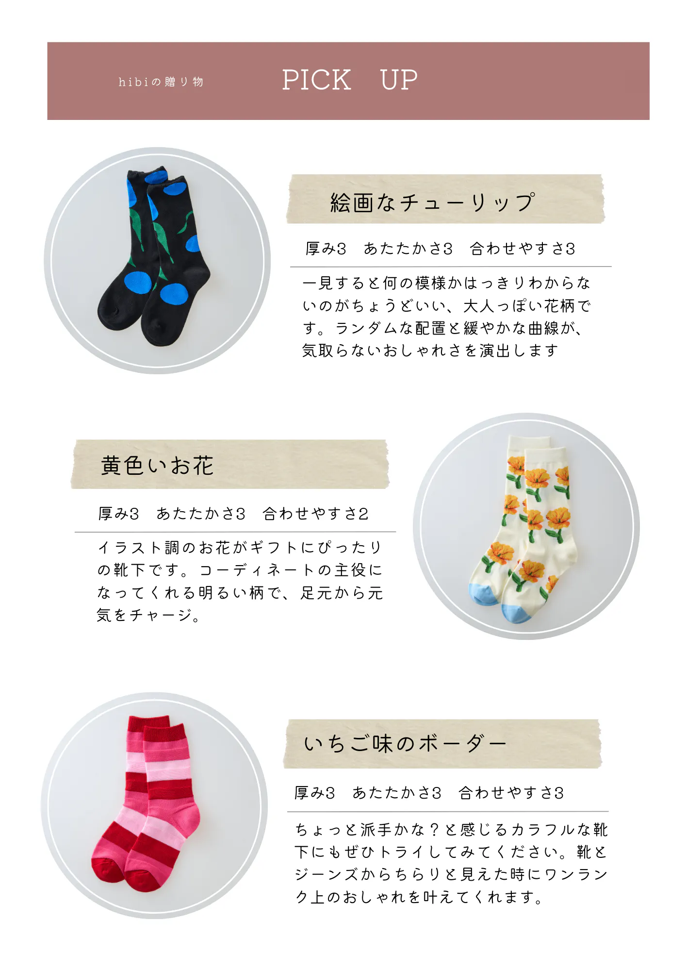3足好きなものを選べるから、1足は柄が華やかなもの、1足は素材感がユニークなもの、1足はベーシックなもの……などと、バリエーションを持たせて贈るのも面白いですね。プレゼントする相手を想って選ぶ時間も、楽しいものです。