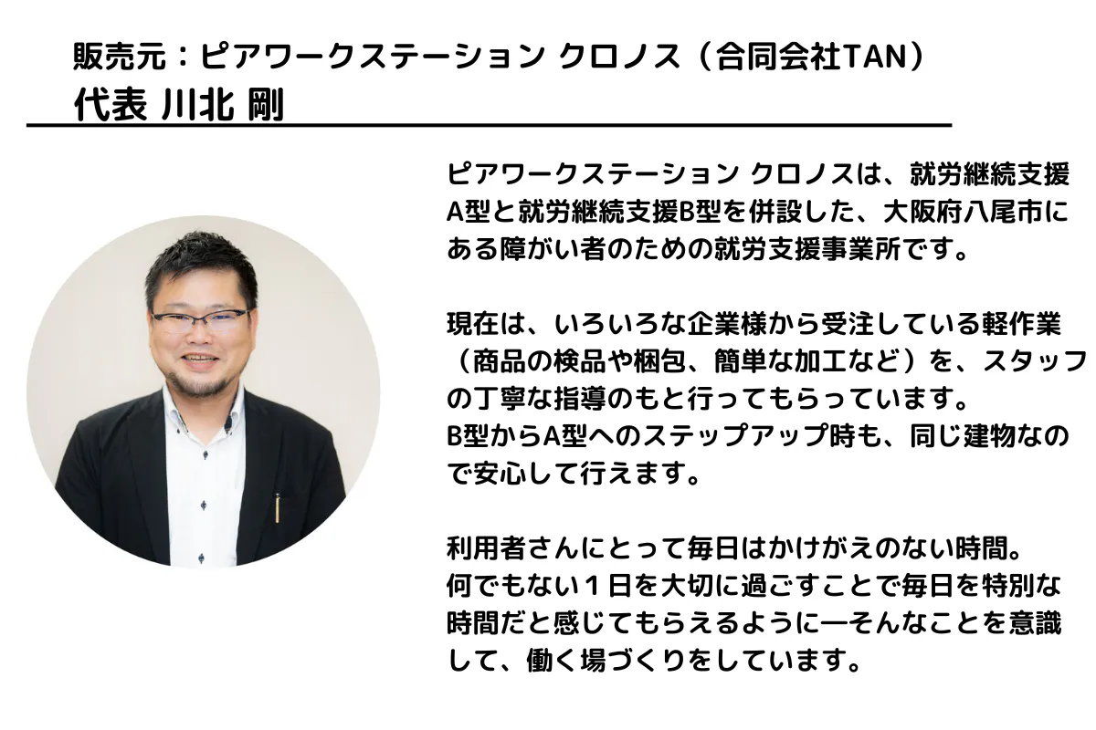 商品代の一部は、就労支援事業所ピアワークステーション クロノスで働く方たちの賃金として支払われます。