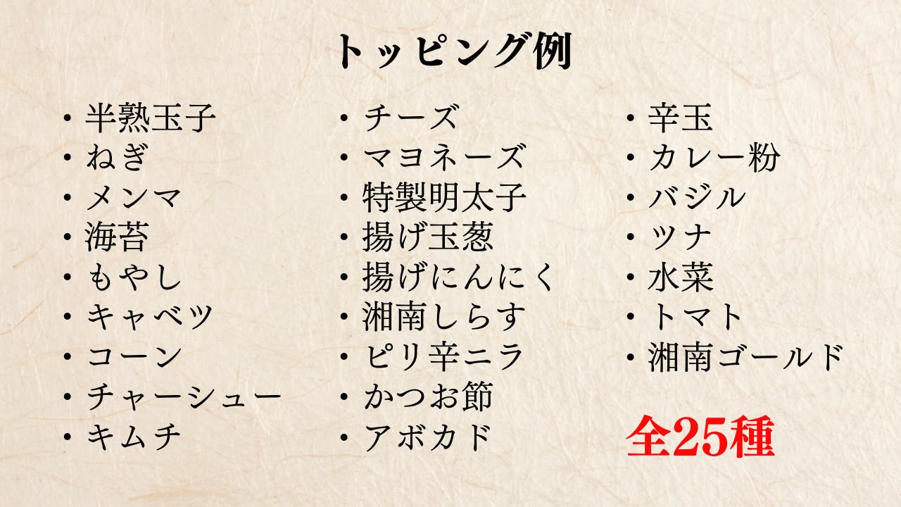 麺の美味しさを追求しながらも日々食べに来てくださるお客様に自分だけの美味しさを見つけて頂きたい。飽きずに何回でも食べに来て欲しい。そんな想いから全25種のトッピングをご用意致します。25種のトッピングはその日のコンディションや食べたい気分、利用シーンなどによって変えられ組み合わせは無限大。ぜひあなただけの油そばを見つけて下さい。