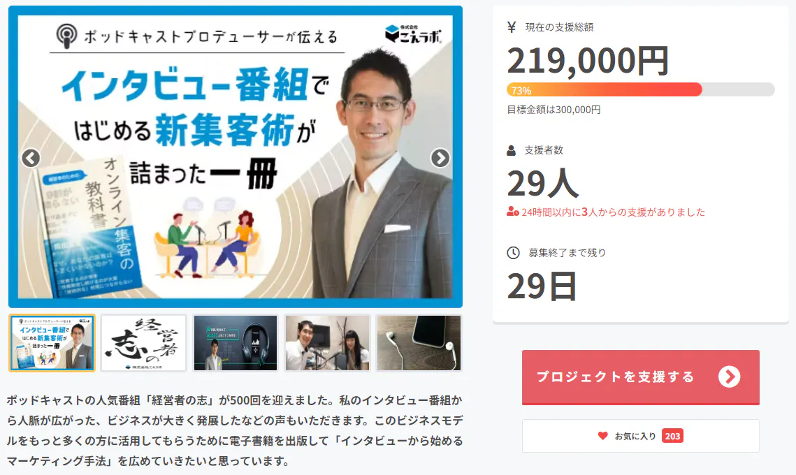 おかげさまで29名の支援者、219,000円(73%)達成しました!本当に多くの方のご支援ありがとうございます。